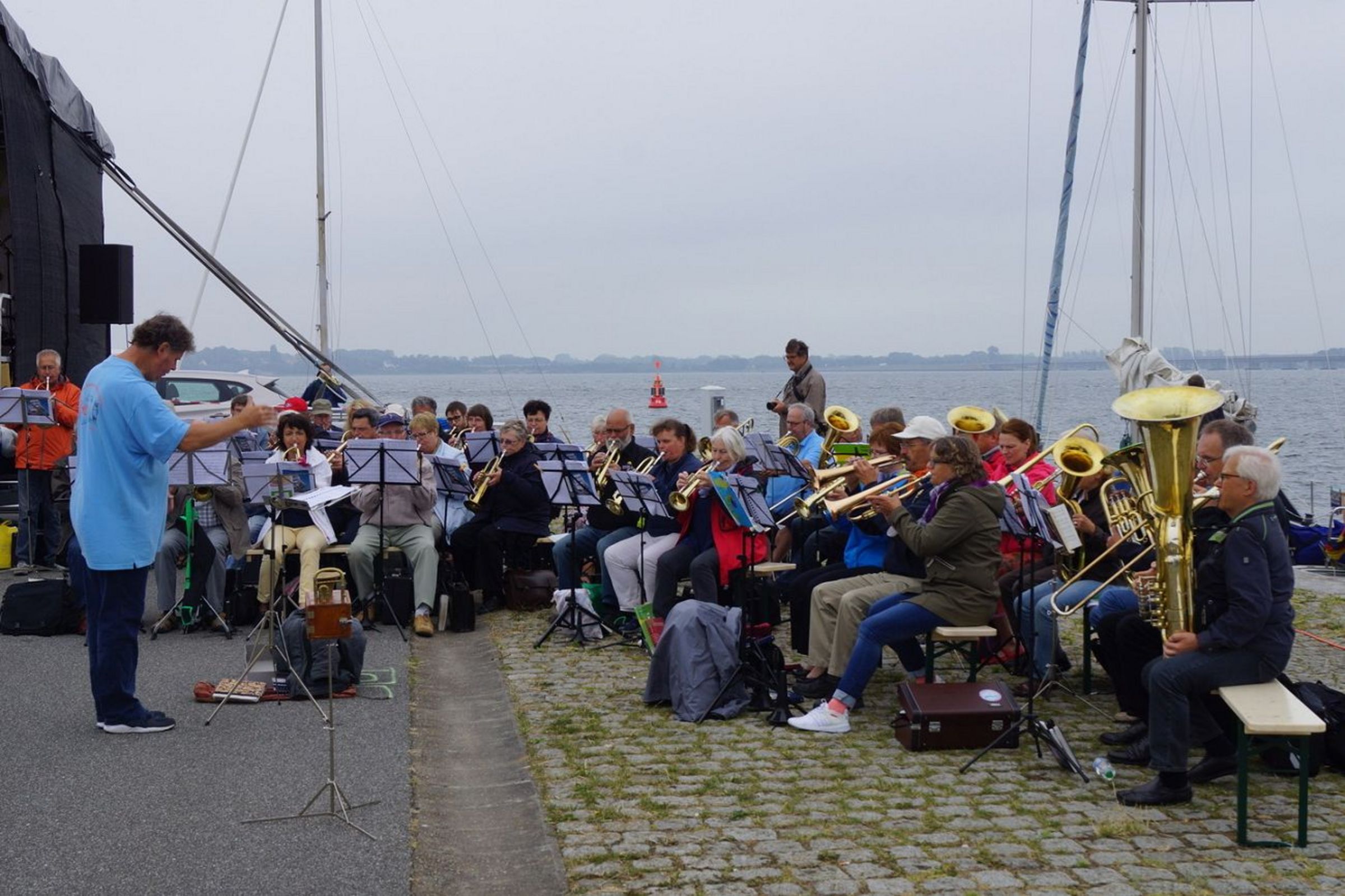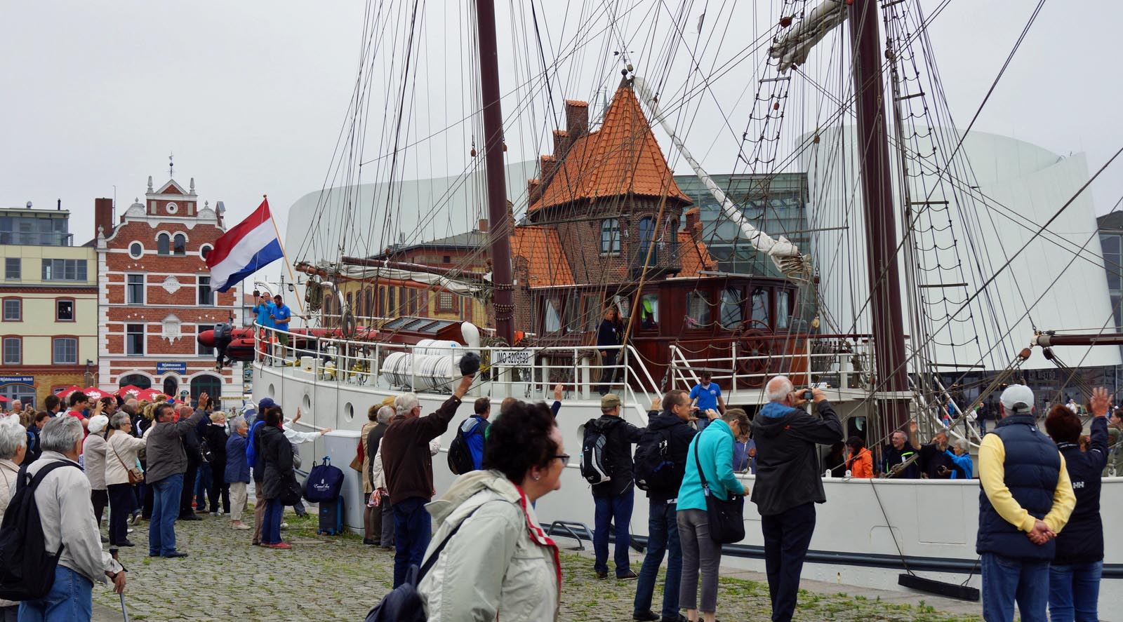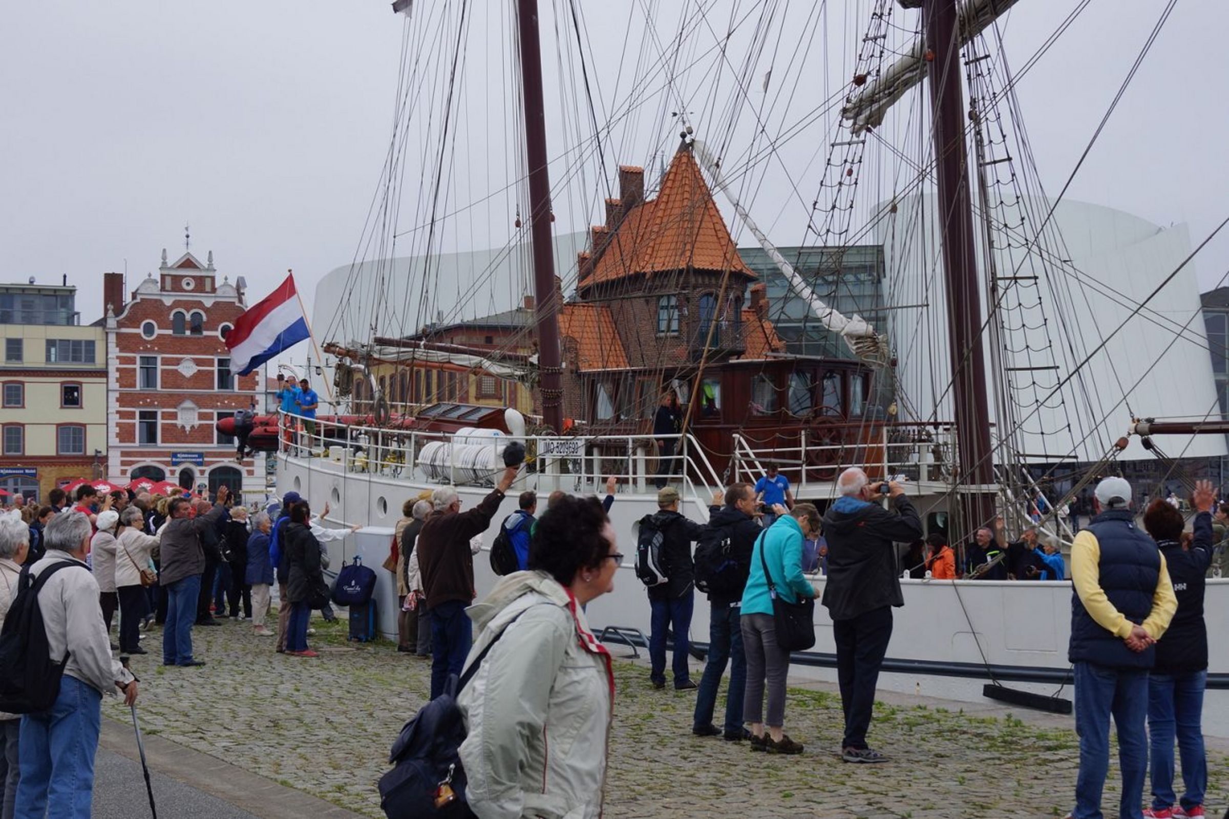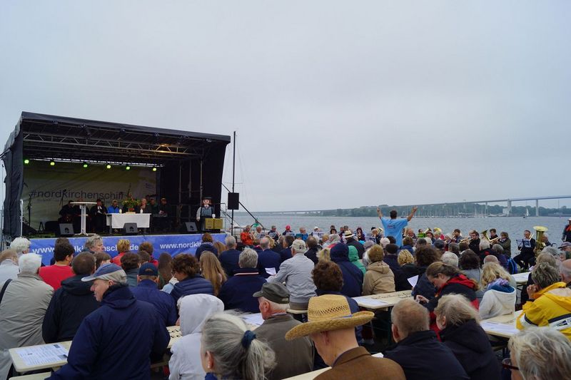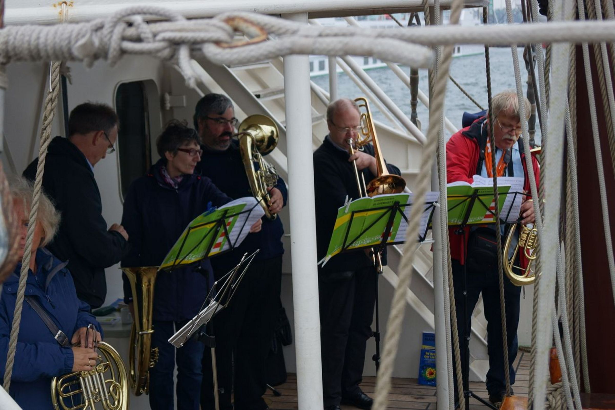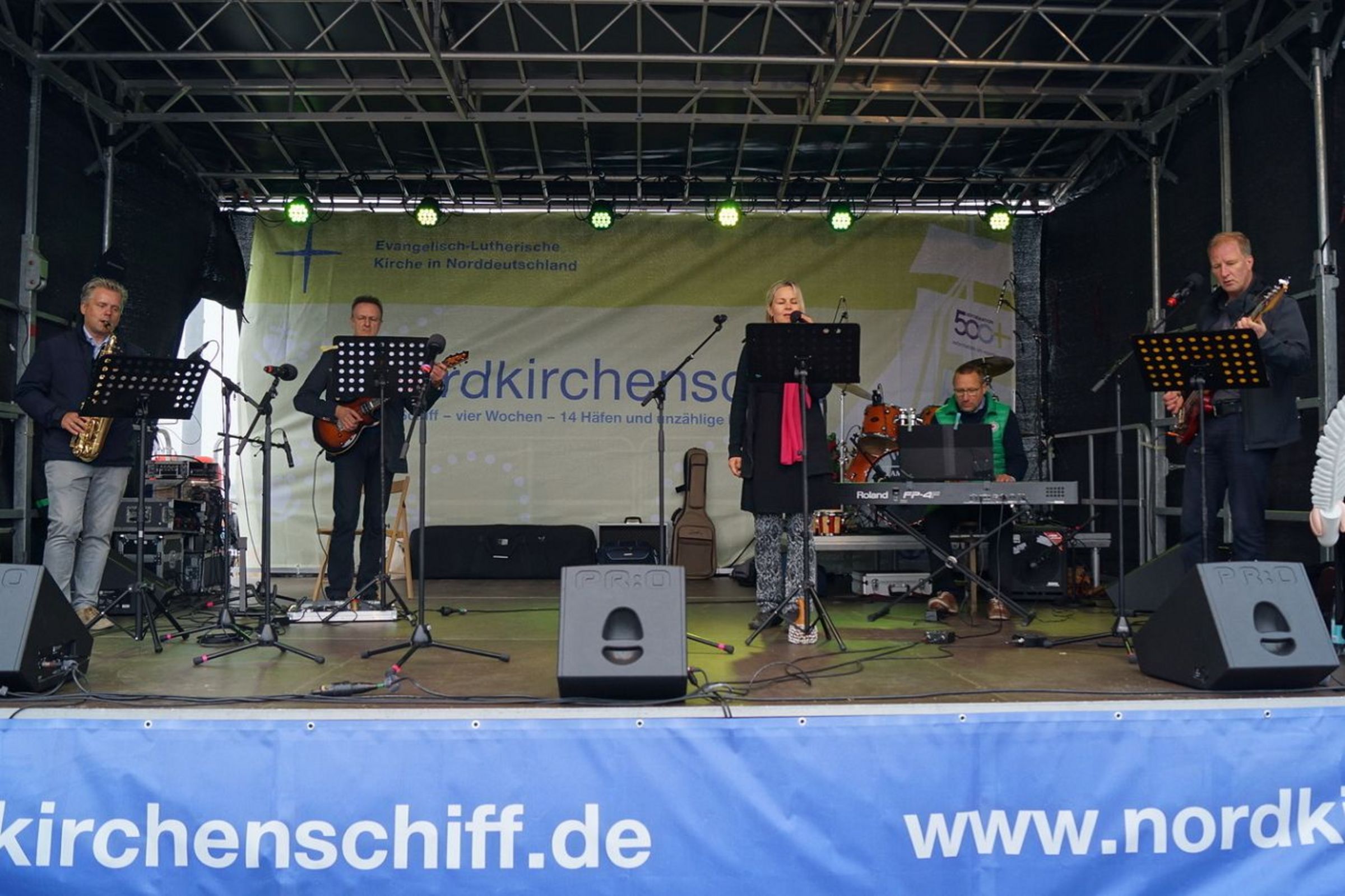Dabei waren die äußeren Umstände alles andere als optimal. Zwar blieben die angekündigten Regenschauer und Gewitter aus, doch die herbstlich anmutenden Temperaturen erschwerten die Festbedingungen. Zudem konnte das Nordkirchenschiff, das im Rahmen des KirchenKreisFests zu seiner großen Reise entlang der Nordkirchenküste aufbrach, wegen der für die Nacht angekündigten schlechten Wetterlage nicht wie geplant von 15 bis 21 Uhr bleiben, sondern machte nur für rund eineinhalb Stunden an der Steinernen Fischbrücke fest. Doch in dieser Zeit drängten sich die Menschen um das Traditionsschiff und der Kirchenkreis bereitete dem segelnden Nordkirchenbotschafter nicht nur einen begeisterten Empfang, sondern begleitete auch den verfrühten Start mit Musik und Segenswünschen. Und so hieß es entsprechend dem Motto des am Nachmittag stattfindenden Gottesdienstes: „Das Wort geht an Bord“!