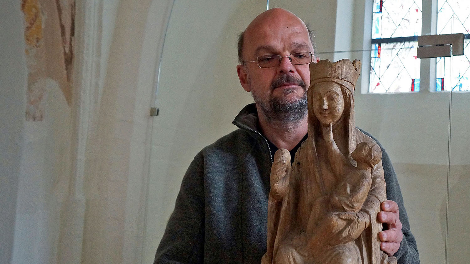 Pastor Detlev Brick mit der „Wolkwitzer Madonna“ in der Kirche in Verchen.