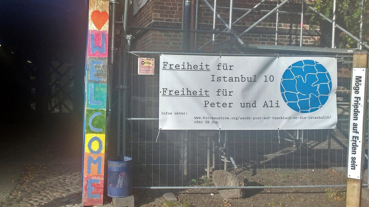 Neben dem Eingang des Greifswalder Doms weist ein Banner auf die Aktionen für die in Istanbul Inhaftierten hin.