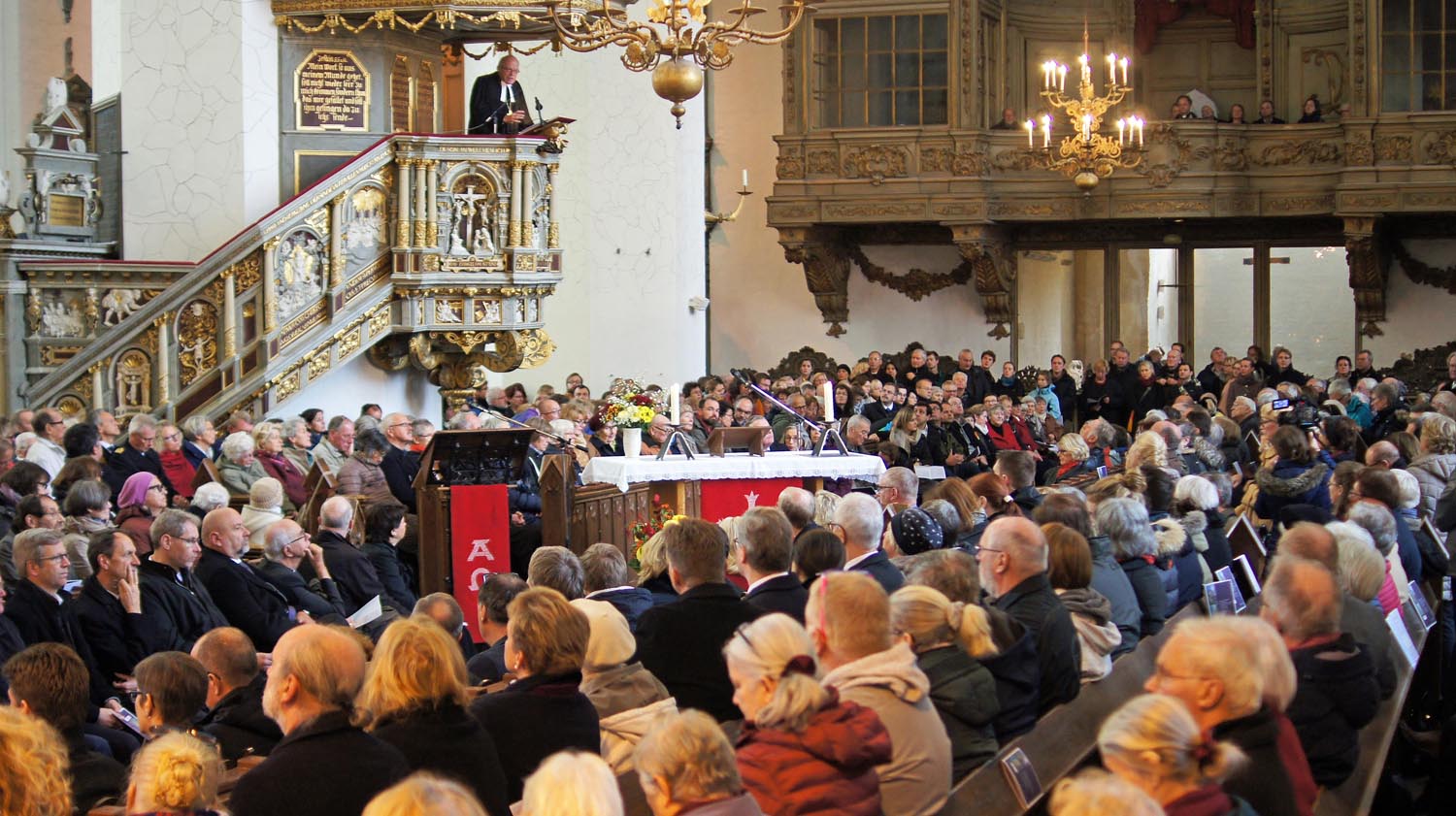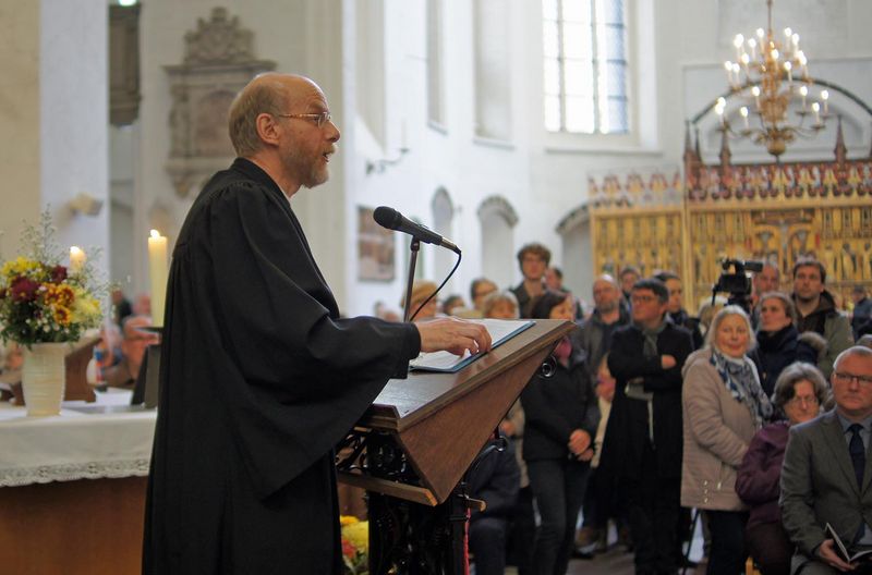 Die Predigt im Festgottesdienst in der St.-Marien-Kirche hielt Landesbischof Gerhard Ulrich. Im Mittelpunkt stand dabei die Bachkantate „Ein feste Burg ist unser Gott“ nach dem gleichnamigen Choral von Martin Luther. Die Reformation habe die Tür aufgestoßen zur Freiheit und Würde jedes Einzelnen, betonte der Landesbischof. Sie habe die Ungerechtigkeit und Spaltung der Gesellschaft enttarnt und den Erniedrigten eine vitale Stimme gegeben.