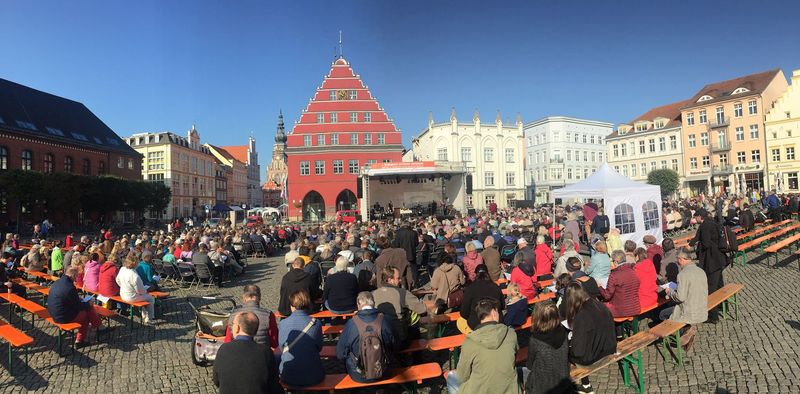 Begonnen hatte der Tag mit einem Eröffnungsgottesdienst um 10 Uhr auf dem Greifswalder Marktplatz. Im Anschluss starteten in der gesamten Innenstadt zahlreiche Veranstaltungen. Zu den Programmpunkten zählten unter anderem eine Podiumsdiskussion mit dem katholischen Erzbischof Dr. Heiner Koch zum Thema „Was die Reformation mit uns allen gemacht hat“, ein „Markt der Möglichkeiten“ auf der Freifläche vor dem Pommerschen Landesmuseum sowie ein Kinderkirchentag in der Katholischen Kirche St. Joseph.