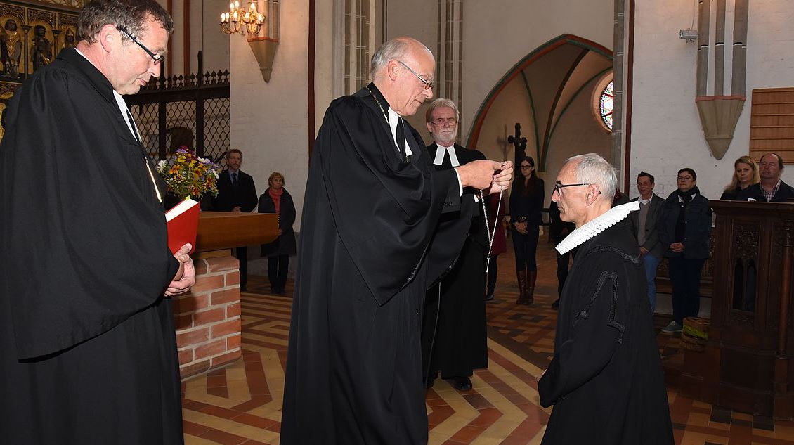Landesbischof Gerhard Ulrich (Mitte) überreichte Diakoniepastor Paul Philipps (r.) das Amtskreuz im Schweriner Dom. (Links: Propst Dr. Karl-Matthias Siegert)