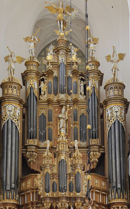 Die Stralsunder Orgel ist außerdem die einzige große Barockorgel in Norddeutschland, deren Prospektpfeifen 1917 nicht zu Kriegszwecken ausgebaut worden waren. Nach ihrer Auslagerung im Zweiten Weltkrieg wurde die Orgel zwischen 1951 und 1959 in mehreren Etappen wieder an ihrem angestammten Platz in der Marienkirche aufgebaut. Dabei erhielt das Instrument auch wieder seine ursprüngliche Disposition, die das historische Klangbild ermöglicht.