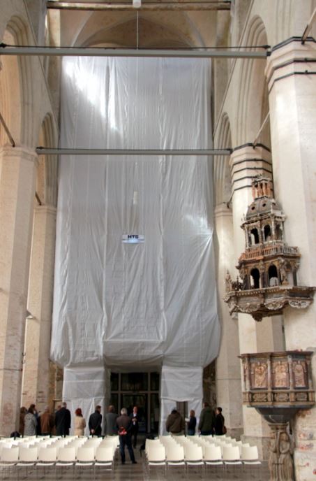 Für die Restaurierungsarbeiten ist die Mehmel-Orgel komplett verhüllt.