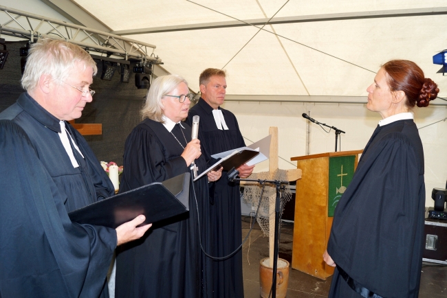 Das Festzelt am Strand von Altefähr war voll besetzt, als vergangenen Sonntag, 26. August, Pastorin Ellen Nemitz nachmittags während eines Gottesdienstes in das Pfarramt der evangelischen Kirchengemeinden Altefähr, Poseritz und Rambin eingeführt wurde. Am 1. Juli war ihre Berufung in das Pfarrdienstverhältnis auf Lebenszeit in der Nordkirche wirksam geworden. Bereits seit Februar 2015 war Ellen Nemitz als Pastorin in das Pfarrdienstverhältnis auf Probe in Altefähr berufen. „Alles wächst aus Gottes Nähe“, sagte Pröpstin Helga Ruch während des Gottesdienstes. Ellen Nemitz werde mit den Menschen vor Ort ihren Glauben und ihr Dasein teilen und mit den Gemeinden durch „dick und dünn“ gehen, so die Pröpstin. Auch wenn Ellen Nemitz schon einige Zeit vor Ort tätig gewesen sei, beginne dennoch mit diesem Tag wieder etwas Neues. Damit bezog sich Helga Ruch auch auf die regionale Pfarrstellenstruktur.