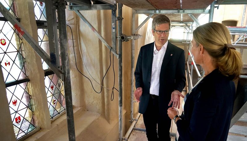 Von der gelungenen Umsetzung des Fensters überzeugte sich Oberbürgermeister Dr. Stefan Fassbinder während eines Besuchs in der Annenkapelle. Er nutzte damit die Chance, noch während die Baugerüste stehen, die farbenprächtigen Wappen aus nächster Nähe zu betrachten, darunter auch das Wappen der Hansestadt Greifswald. Für die Umsetzung des Wappens hatte die Greifswalder Bürgerschaft im März eine Spende in Höhe von 1.000 Euro zugesagt.