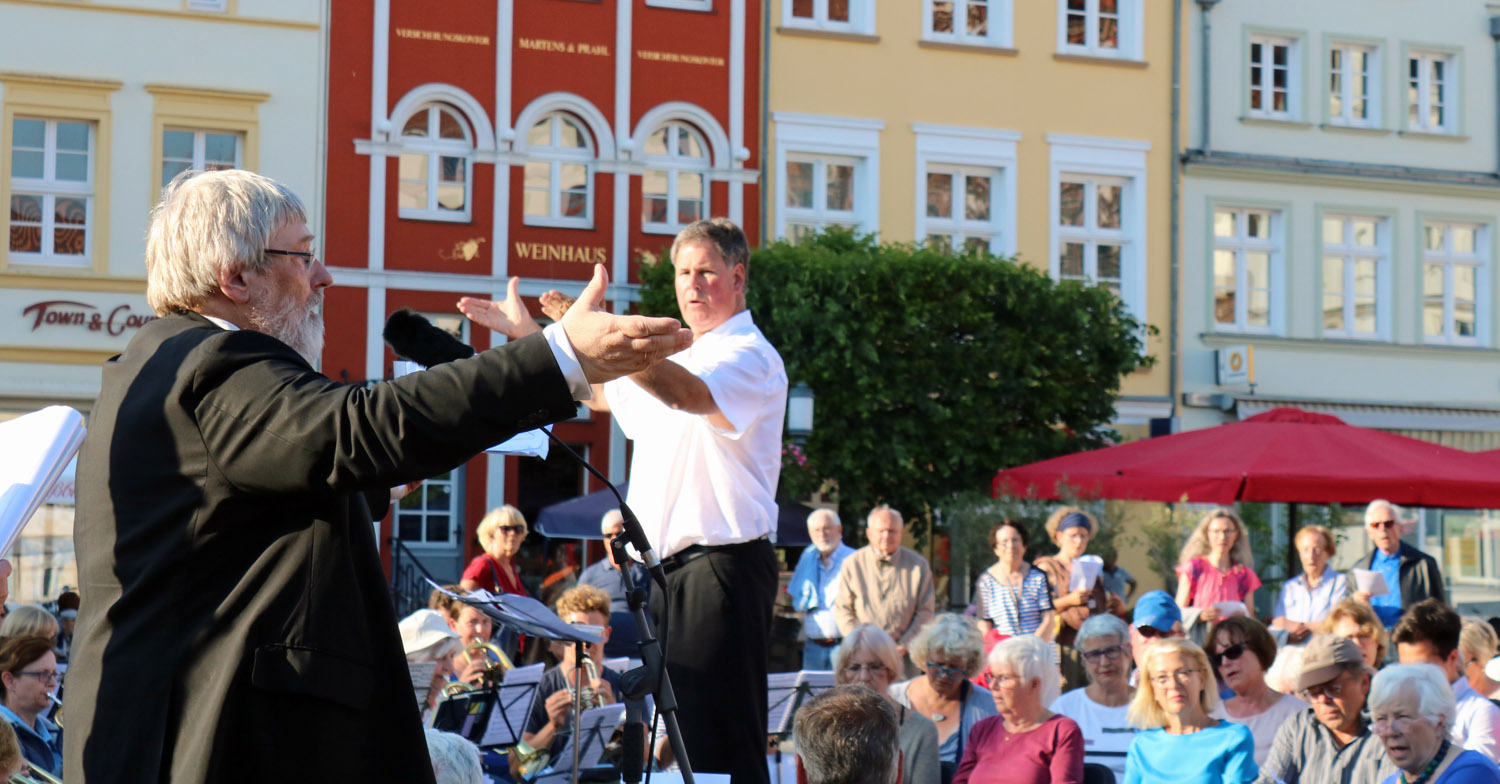 Kirchenmusikdirektor Jochen A. Modeß (li.) und Landesposaunenwart Martin Huss beim Eröffnungsgottesdienst der Greifswalder Bachwocher auf dem Marktplatz der Hansestadt.