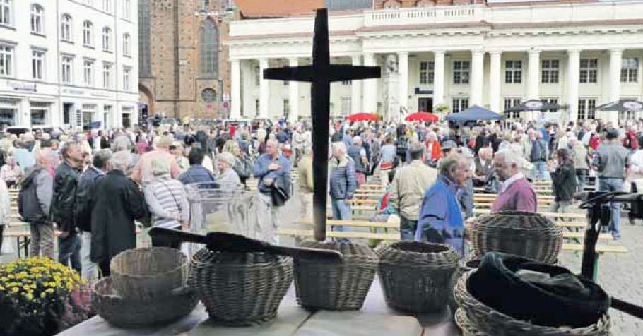 Ganz anders sieht der Marktplatz ein paar Tage früher aus. Bei einer als Mahnwache angemeldeten AfD-Kundgebung mit etwa 200 Teilnehmern stehen sich zwei Gruppen feindselig gegenüber, denn das Bündnis „Schwerin für alle“ hat zu einer Gegendemonstration 400 Teilnehmer mobilisiert. vom Oberbürgermeister über Kirchenleute über „ganz normale Bürger“ bis hin zu Antifa-Gruppen. Statt Gesprächen gibt es nur einige geschriene Beschimpfungen. Drei Kreuze, die AfD-Anhänger in der Hand halten, werden durch sie aus Symbolen der Versöhnung zu Symbolen des Hasses. Einer der Redner für das Bündnis „Schwerin für alle“ ist Heiko Lietz, ehemaliger Pastor und Bürgerrechtler. Wie damals 1989 auf dem Alten Garten bei der großen Oktoberdemonstration stellt er sich in die Mitte des Platzes – und ruft wie damals zu einem gewaltfreien Dialog auf. Als er auf die AfD-Abgeordnete Petra Federau zugeht, um mit ihr zu sprechen, kommen Buh-Rufe von beiden Seiten. Doch auch sie geht ihm entgegen, bis beide sich gegenüberstehen und einige Worte wechseln. Doch dann wird es einem Polizisten zu heikel und er trennt beide. Aber die Geste überträgt sich – auch nach dem offiziellen Ende der Demonstrationen bleibt es ruhig.