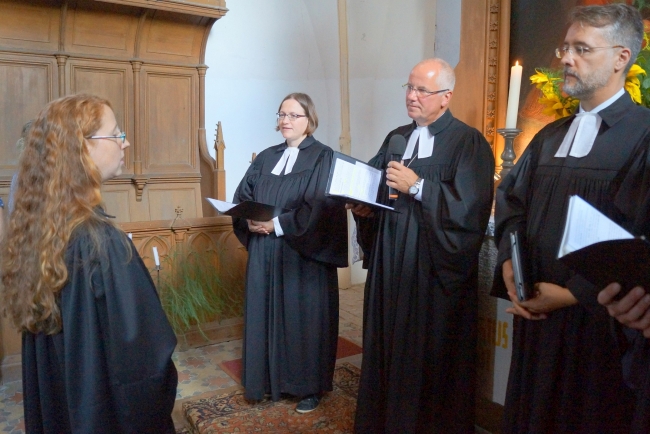 Während eines Gottesdienstes in der Kartlower St. Johanniskirche, ungefähr 30 Kilometer südlich von Greifswald gelegen, wurde am gestrigen Nachmittag, Sonntag, 2. September, Pastorin Silke Kühn von Propst Gerd Panknin in das Pfarramt der evangelischen Kirchengemeinden Kartlow-Völschow (75 Prozent) und Hohenmocker-Daberkow (25 Prozent) eingeführt. Seit Februar 2015 war Silke Kühn als Pastorin in das Pfarrdienstverhältnis auf Probe in Kartlow berufen. Als Geschenk hatte Gerd Panknin eine Rosenpflanze für den Kartlower Pfarrgarten mitgebracht. Wie bei der Rose mit ihren Blüten und ihren Dornen gebe es im Leben und im Dienst neben Schönem auch Dinge, die schmerzen, so Gerd Panknin. „Aber Jesus hat uns gelehrt, mit diesen Dornen umzugehen.“ Und wie bei der Rose müsse auch im Gemeindeleben immer wieder Neues wachsen und werden. Die Liebe Gottes möge Silke Kühns Dienst begleiten und die Menschen miteinander verbinden, so der Propst.