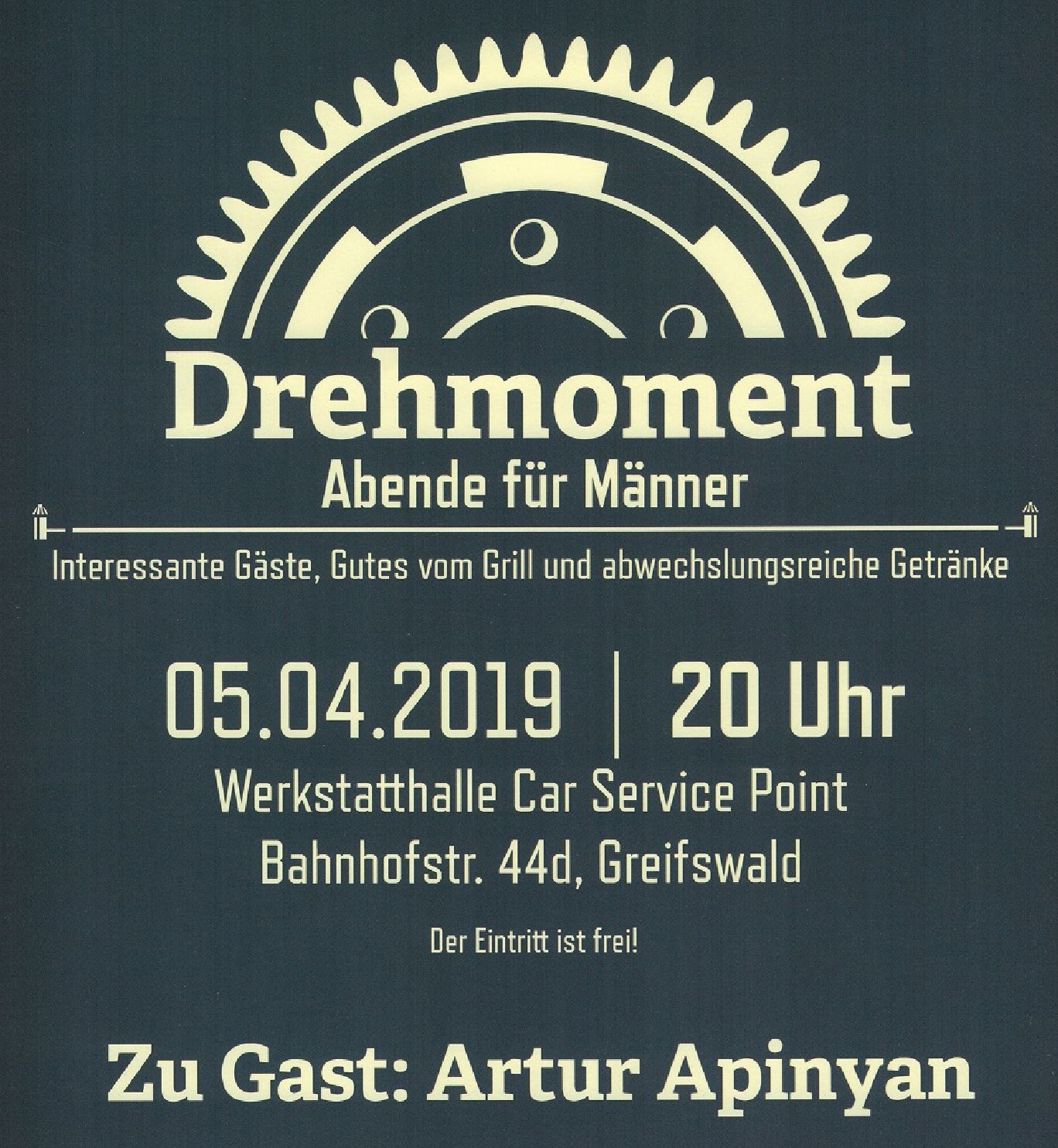 03.04.2019 · Greifswald. Unter dem Titel „Drehmoment“ startet in Greifswald eine neue Veranstaltungsreihe von Männern für Männer. Mit wechselnden Gästen und in lockerer Runde wollen sie über ihre persönlichen Geschichten und existentielle Fragen ins Gespräch kommen. Beim ersten Termin am 5. April in den Hallen der Firma CarServicePoint ist Songwriter und Sänger Artur Apinyan dabei.
