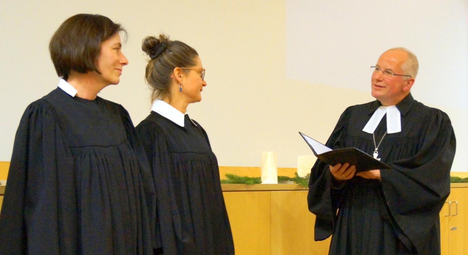 Mit einem Gottesdienst an einem ungewöhnlichen Ort, in einem Hörsaal des Greifswalder Universitätsklinikums, wurden Pastorin Brita Bartels und Pastorin Sandra Hille am Donnerstag, 5. Dezember, in die Pfarrstellen für Krankenhausseelsorge eingeführt. Der Kirchenkreisrat des Pommerschen Evangelischen Kirchenkreises (PEK) hatte beide Pastorinnen im Oktober neu für acht Jahre in die 1. und 2. Pfarrstelle des PEK für Krankenhausseelsorge am Universitätsklinikum Greifswald berufen. Während des Einführungsgottesdienstes erhielten beide Pastorinnen ihre Berufungsurkunden. Den Segen für den Dienst sprach ihnen Propst Gerd Panknin zu.