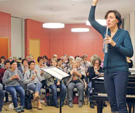Und die leistet Christiane Hrasky auf ihrer ersten „Tournee“ mit großem Elan. Fünf Töne zum Nachsingen hatte sie auf dem Flügel angeschlagen. Allerdings sollen diese nicht in den Raum gesungen, sondern durch den Strohhalm ins Wasser geblasen werden – was für einiges Vergnügen sorgt. „Die Stimmlippen kommen durch den Gegendruck in ein natürliches Vibrieren“, erklärt Hrasky. „Sie werden erstaunt sein.“ Und tatsächlich. Die Töne, die den Raum nach dieser sogenannten „Lax Vox“-Übung erfüllen, klingen voluminöser, schweben über freudig überraschte Gesichter.