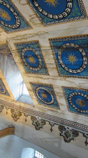 In die kleine Kirche in Benz passt ein ganzer Sternenhimmel. Zumindest im verkleinerten Maßstab. Wer das Gotteshaus auf der Insel Usedom betritt, schaut sofort nach oben und erblickt ein farbenprächtig ausgestaltetes Firmament. Die hölzerne Decke schmücken Kassettenfelder, die mit Sternen und Rosetten bemalt sind. Die faszinierenden Malereien wurden im Jahr 1909 vom Stettiner Hof-Dekorationsmaler Adolf Dittmer angefertigt.