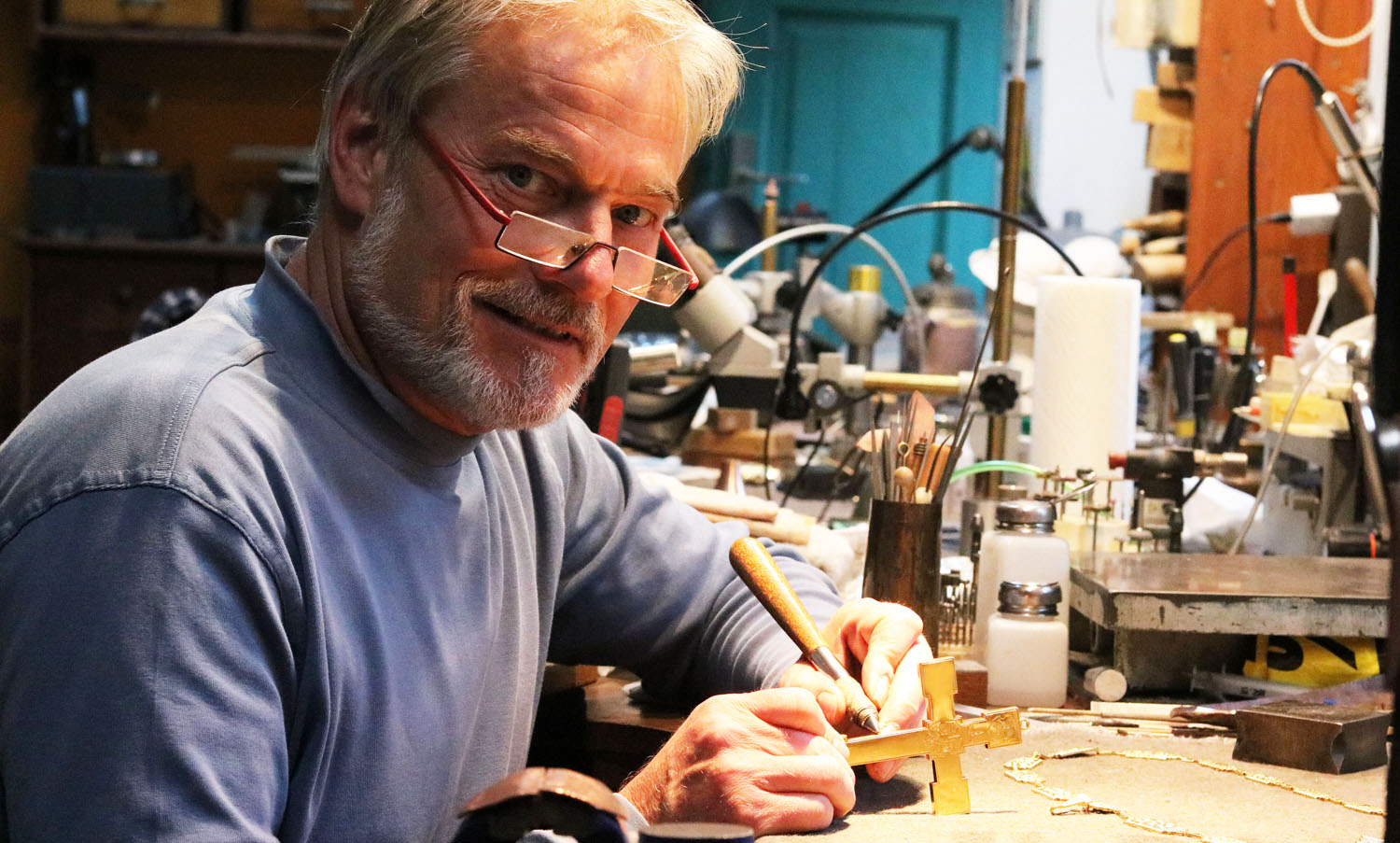 Prüfend betrachtet Thomas Wurm das goldene Kreuz vor ihm auf der Werkbank, dann nimmt er es an zwei viereckigen Kettengliedern hoch und hält es vor das Fenster. Als sich kurz die Sonne zeigt, glimmt das Kreuz in der dämmerigen Werkstatt auf und erhellt das Gesicht des Restaurators einen Moment lang mit goldenem Licht.