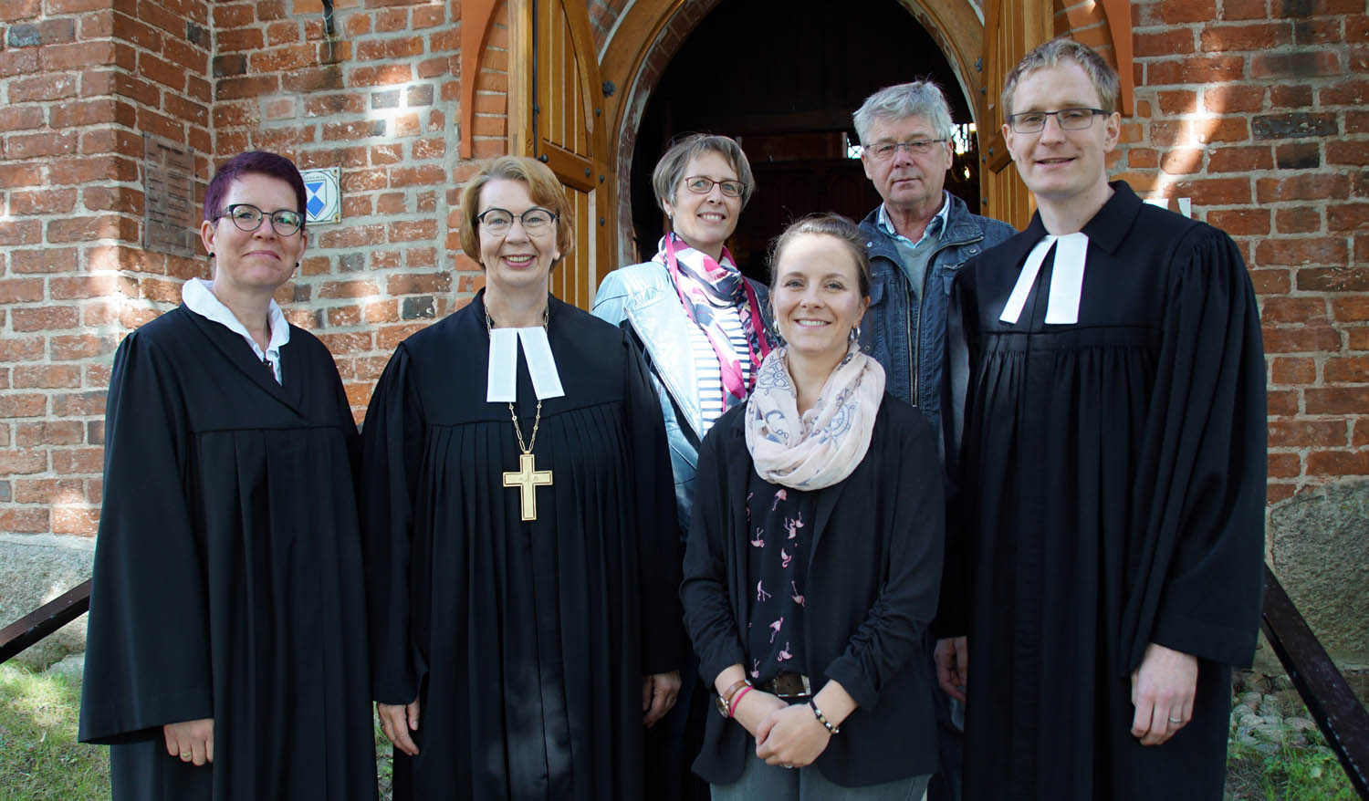 Am Rande des Regionalgottesdienstes am 8. September 2019 in Tessin (v.l.n.r.): Prädikantin Sylvia Schacky (Sanitz), Landesbischöfin Kristina Kühnbaum-Schmidt, die Kirchengemeinderatsmitglieder Katrin Dernovaja, Stefanie Voß und Alfred Sloksnat sowie Pastor Sebastian Gunkel (Tessin).