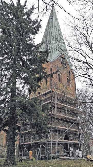 Mit dem Gerüstbau begann jetzt die umfangreiche Turmsanierung der Spornitzer Kirche. Sie soll bis Oktober dauern und rund 540 000 Euro kosten. In das Kirchenschiff gelangt man während der Sanierungsarbeiten nur durch den Seiteneingang am Altarraum.