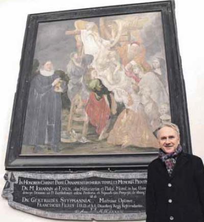 So wie Professor Johann von Essen (1610-1676), der auf einem 3 mal 2,50 Meter großen Ölgemälde von einem unbekannten Maler verewigt wurde – und mittendrin im Jerusalem des Jahres 31 steht. Direkt neben Jesus am Kreuz. Es war von Essens Sohn, der das Epitaph zum Gedenken an den Vater 1684 errichten ließ. Die imposante Pfarrersfigur stellt der Künstler mit Frau und Tochter in eine seitenverkehrte Kopie der Kreuzabnahme von Peter Paul Rubens aus dem Antwerpener Dom.