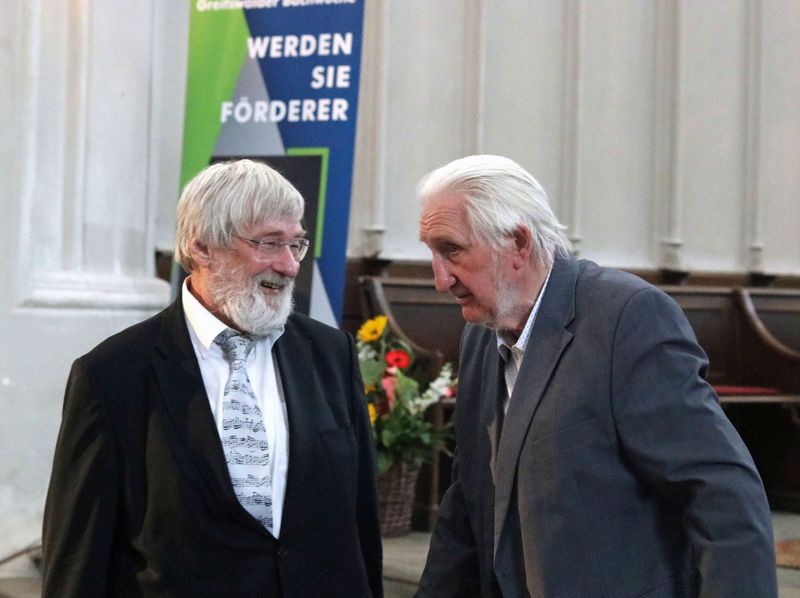 Dabei führten der Schönberger Organist Christoph D. Minke und das Bachwochenorchester Kompositionen von zwei früheren langjährigen Bachwochenleitern auf: ein Orgelstück des 95-jährigen Manfred Schlenker, Leiter der Bachwoche von 1975 bis 1986, und die eigens für den Abend komponierte Collage B-A-C-H-wo-C-H-E-75 von Professor Jochen A. Modeß. Beide waren bei der Feier im Greifswalder Dom St. Nikolai anwesend.