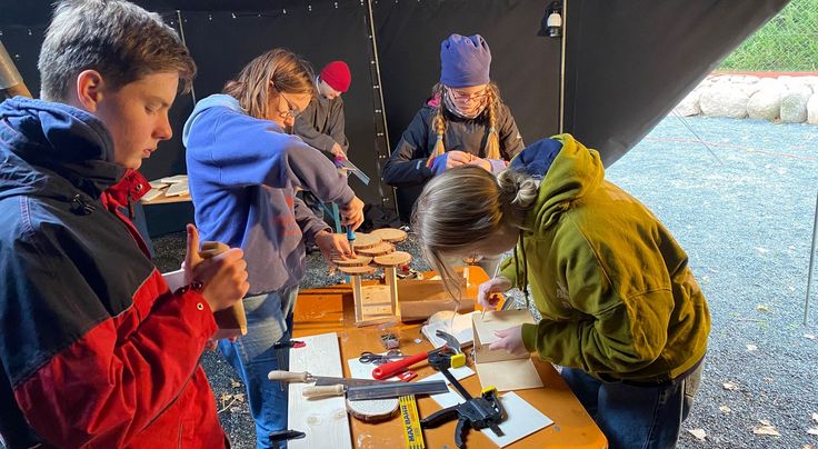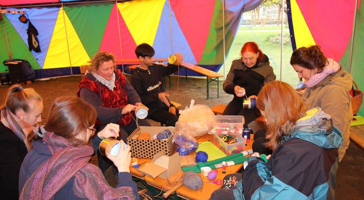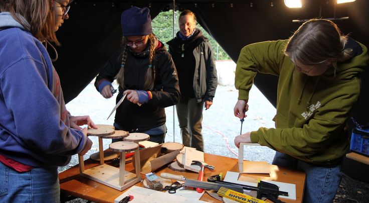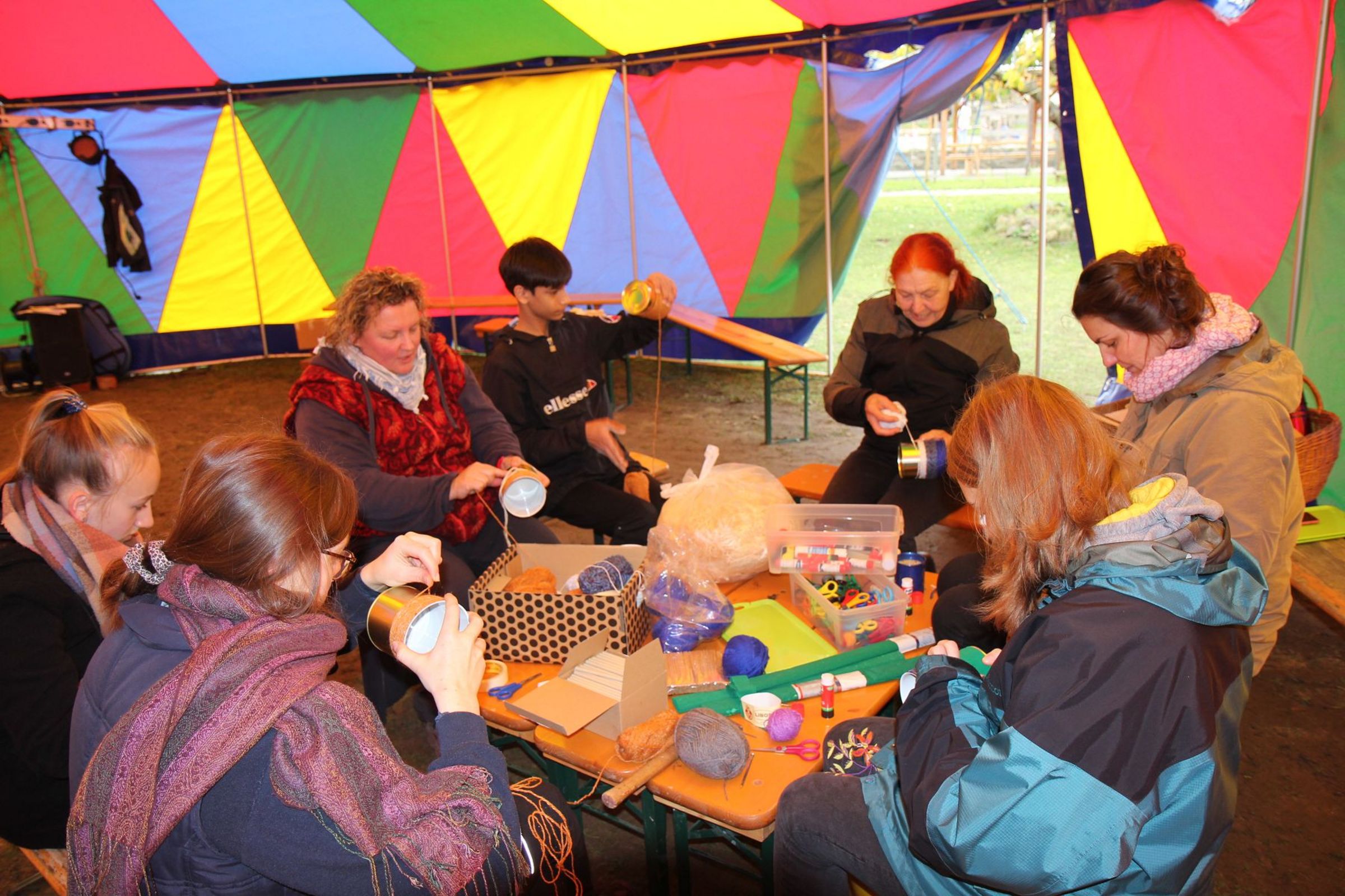 Gesägt, geschliffen, gebohrt und geschraubt wurde beim Workshop „Wir bauen ein Vogelhaus“. Auch hier sind die Mädchen und Jungen nicht zu bremsen. Diskutieren wie das Dach aus Baumscheiben am besten hält und einigermaßen dicht wird, um die späteren gefiederten Bewohner gut zu behausen. Weltweite Zusammenhänge, regionale Umweltsünden und -katastrophen, die das Klima bedrohen, bringt Jannis Herzog von Plant for the Planet mit seinem Weltspiel bei den jungen Klima-Aktivisten ins Gespräch.