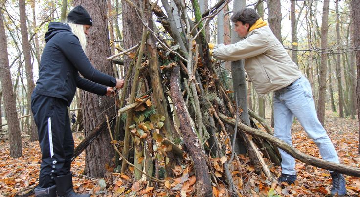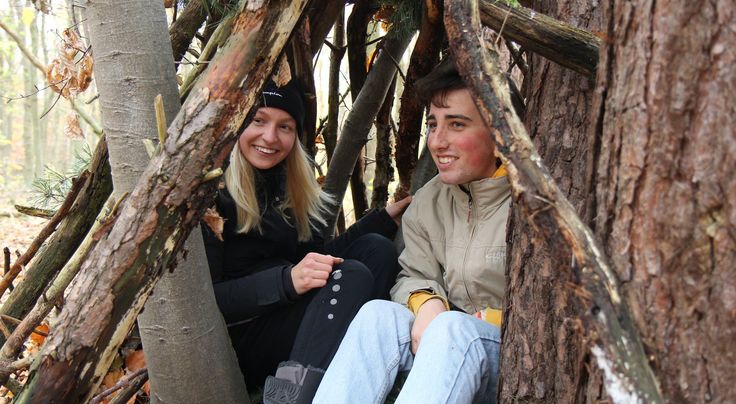 Weitere Workshops fanden direkt im Wald statt: Nina und Lea aus Neubrandenburg sowie Sofie und Milena aus Friedland und Umgebung lernen etwas ganz Neues kennen: Landart. Ohne Klebstoff, Band oder Nägel werden dabei mit Naturmaterialien, wie Rinde, Zweigen, Gräser oder Farn, fantasievoll Kunstwerke direkt im Wald installiert. Ein Stück weiter sammeln zwei Gruppen Äste, Baumstämme und Blätter. Daraus bauen sie Schutzhütten. „Zuerst muss ein passender Standort gefunden werden. Nicht in einer Mulde, in der sich Regenwasser sammeln kann. Und ebenso nicht auf einem Hügel. Denn dort weht der Wind zu stark“, erklärt Teamer Ben Arp, der gemeinsam mit Teamerin Sarah Düwell einen Unterschlupf als Modell für die Jugendlichen schafft.