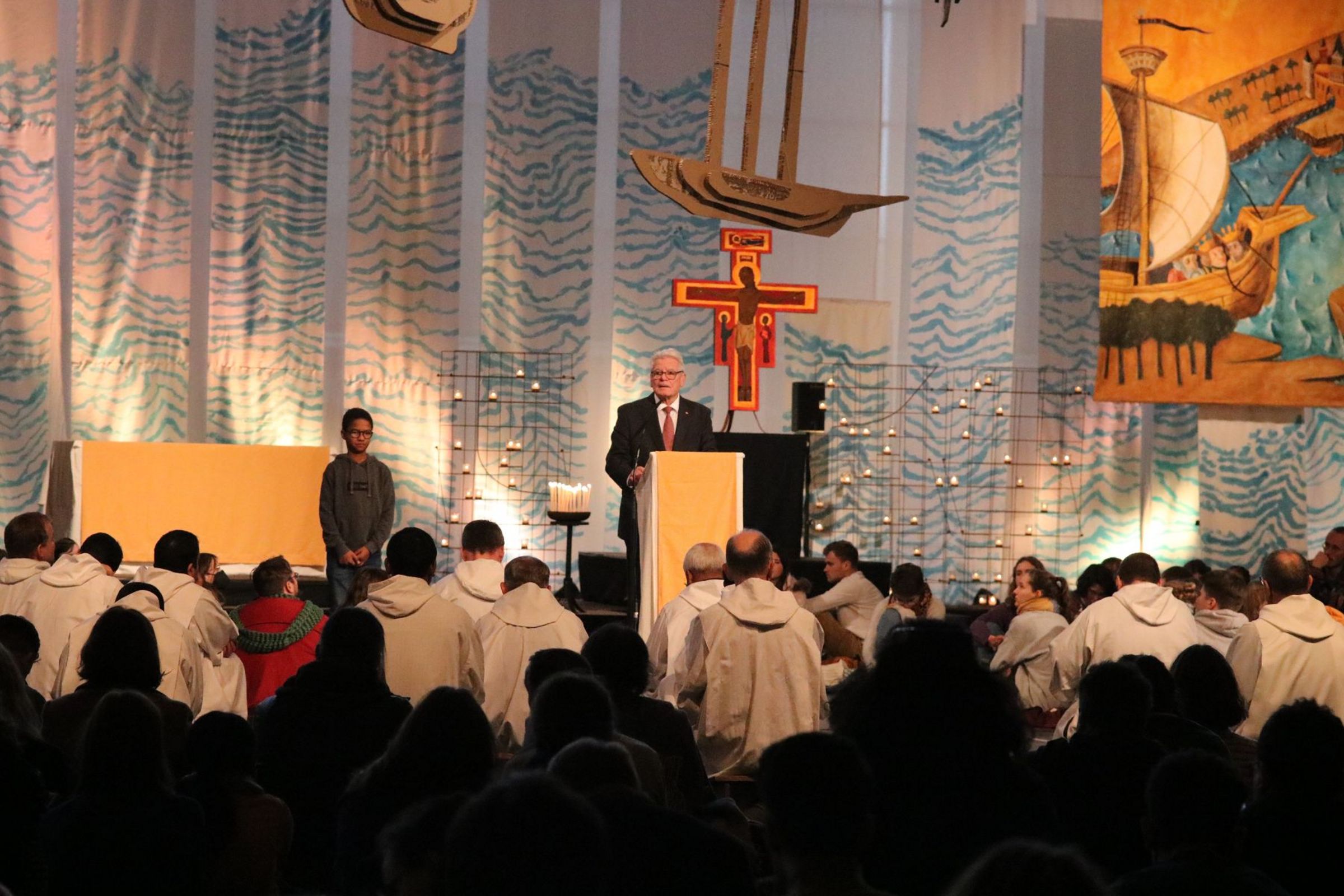 „Und wenn ich nun auf Eure Versammlung im Geiste von Taizé sehe, dann stelle ich mir vor, dass Ihr nicht singt, betet und diskutiert um aus der Welt zu fliehen, sondern dass Eure Suche nach dem, was die Welt nicht geben kann, Euren Glauben stärkt, der diese Welt nicht verachtet, sondern sie besser machen will“, schloss Gauck seine Rede.