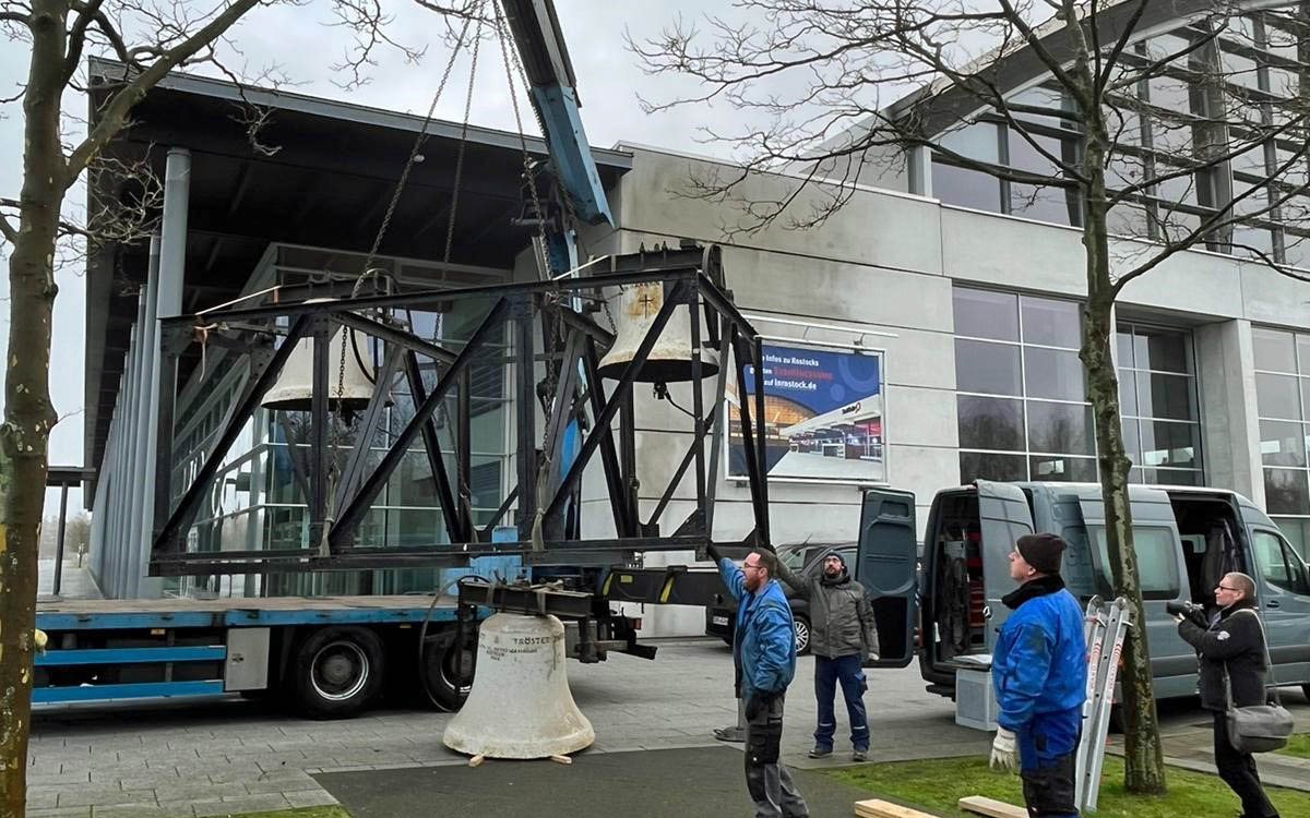 Am 10. Januar wird das provisorische Geläut zurückkommen und dann noch einige Zeit seinen Dienst am Fuße der Petrikirche versehen. In hoffentlich nicht allzu weiter Ferne sollen im imposanten Kirchturm die eigentlichen Bronzeglocken wieder Einzug halten. Dafür sammeln Innenstadtgemeinde und Förderverein schon kräftig Spenden und haben Bau-und Förderanträge gestellt. Zu Weihnachten finden die Vespern und Gottesdienste der Innenstadtgemeinde übrigens in der Marien-, Nikolai- und Unikirche statt, so dass auch daher der Umzug des Geläuts vertretbar war. | Infos: www.kirche-mv.de/rostock-innenstadtgemeinde