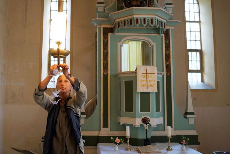 Veranstaltungsreihen „Dorfkirche Mon Amour“ und „Dorf.Kirche.Klingt“ Schwebende Papierkraniche vor dem Altar