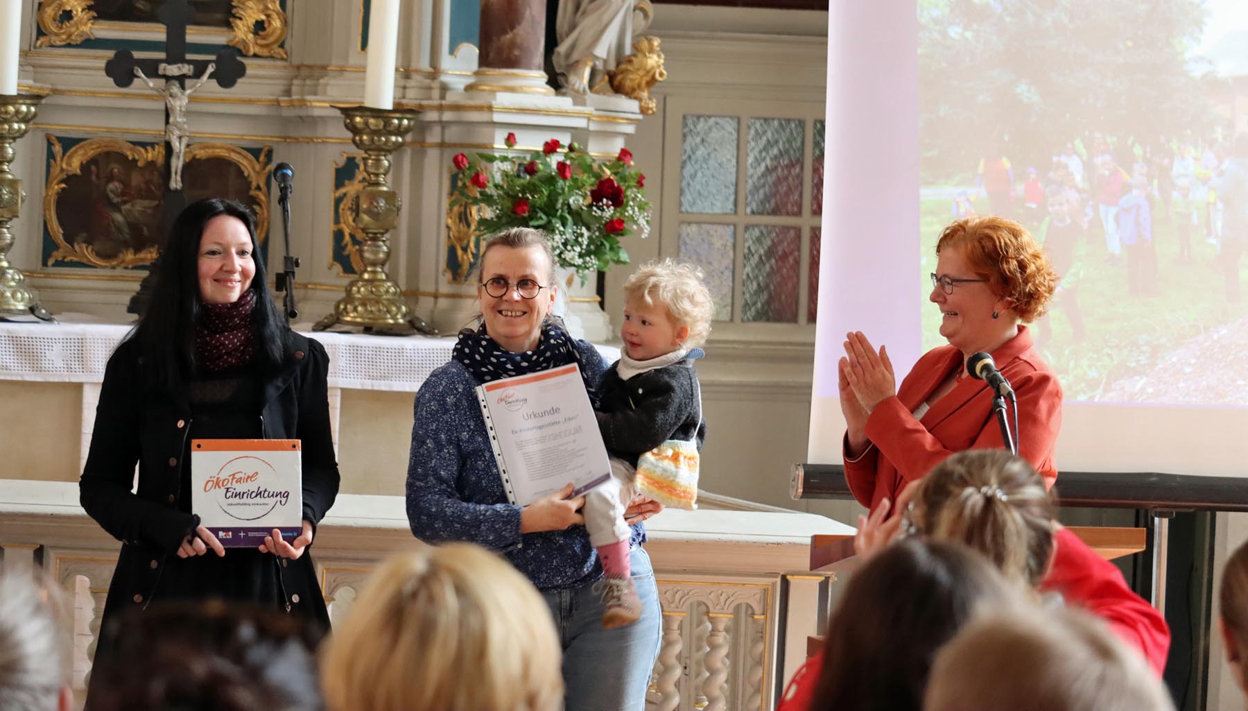 Im Gottesdienst der Kirchengemeinde Heilgeist-Voigdehagen erzählten Pastor Christoph Krasemann und das Kamel Hilde, eine Handpuppe, gemeinsam die Geschichte der Schöpfung und, dass man diese respektieren und achten solle. Anschließend wurde die Auszeichnung von Regina Möller (Referentin für ökofaire Beschaffung im Zentrum Kirchlicher Dienste Rostock, an Anett Kindler, Einsatzstellenleitung der Kita „EDEN“, und Madlen Liebenow, stellv. Einsatzstellenleitung, übergeben.