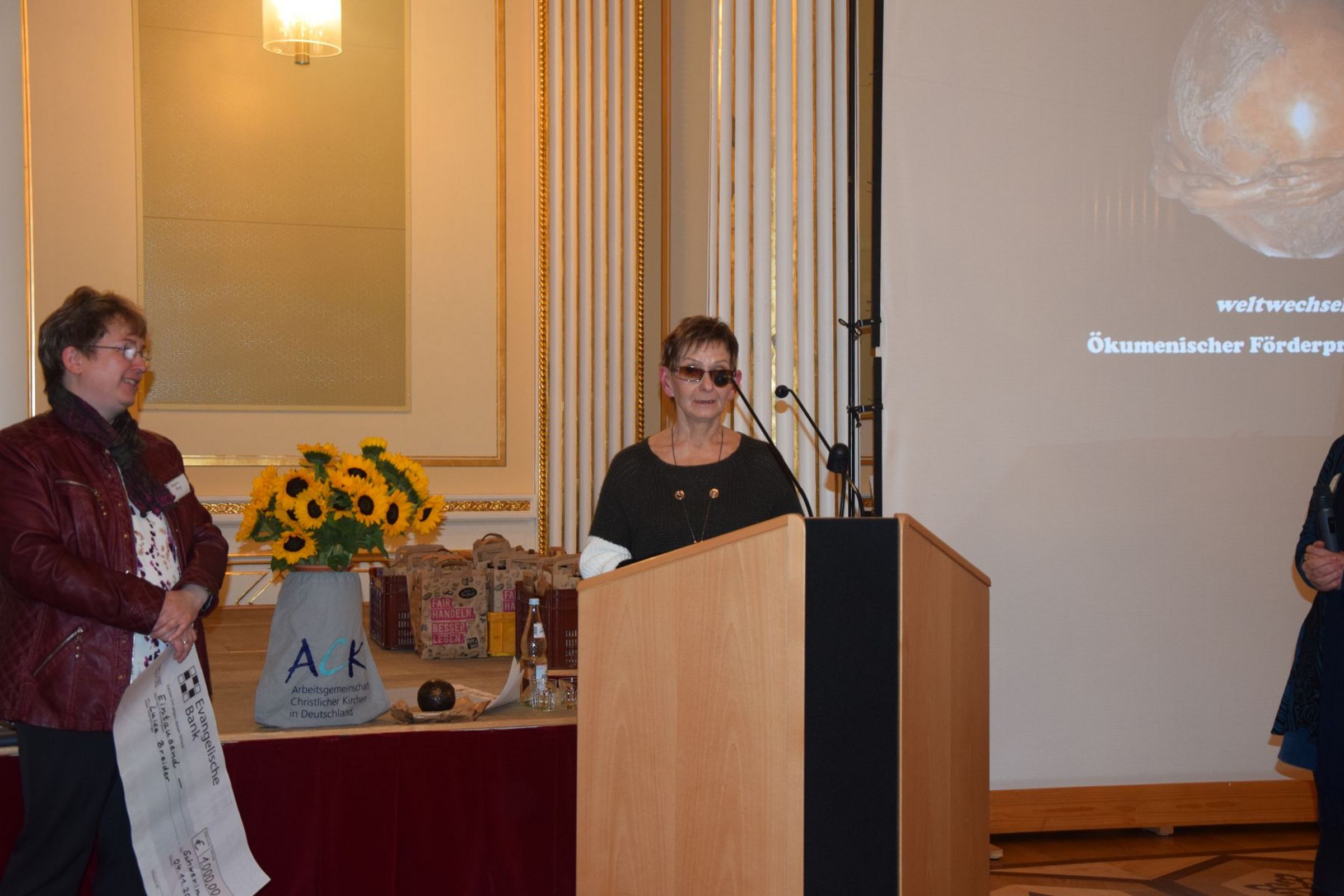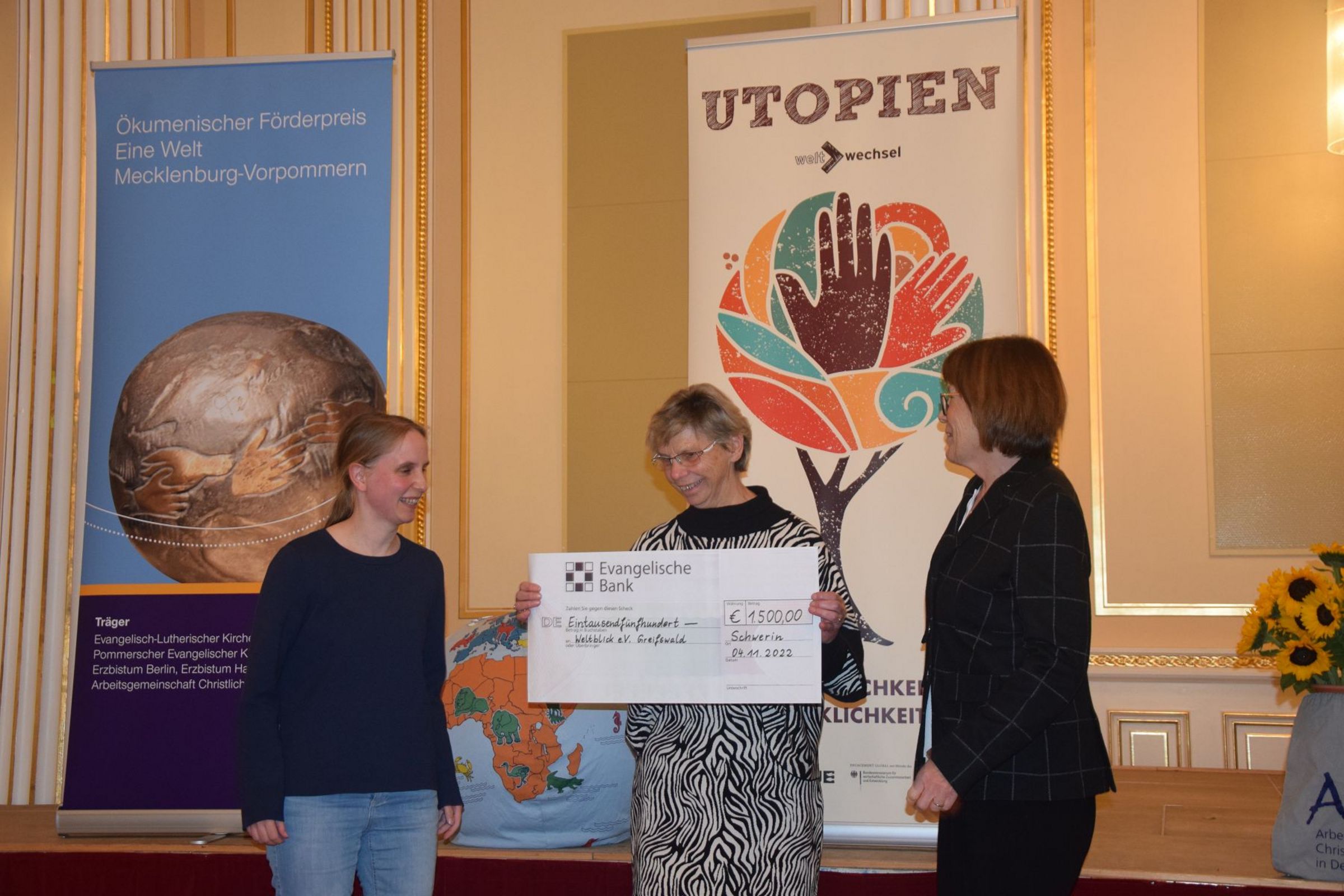 Über den zweiten Förderpreis und 1.500 Euro freute sich der Verein „Weltblick e.V.“ mit dem Weltladen Greifswald. Der Verein sei über die Stadt hinaus „ein wichtiger entwicklungspolitischer Akteur in MV, der versucht, die Themen der globalen Gerechtigkeit und des Fairen Handels mehr in die gesellschaftliche Wahrnehmung, aber auch ins Bewusstsein der Kommune zu bringen“, sagte Laudatorin Erika Winter von der Arbeitsgemeinschaft Christlicher Kirchen MV (ACK). Dass dies gelingt, zeige die Auszeichnung Greifswalds als Fair Trade-Stadt und die Einführung des „Greifswalder Städtekaffees“.