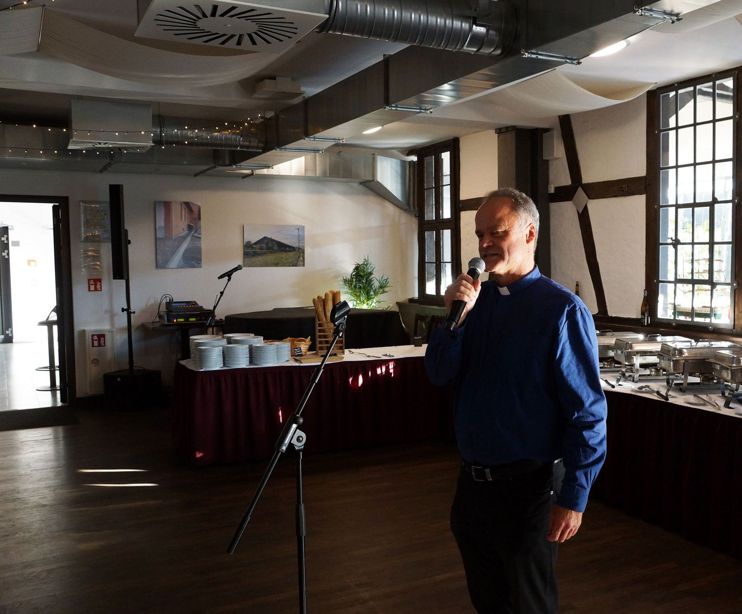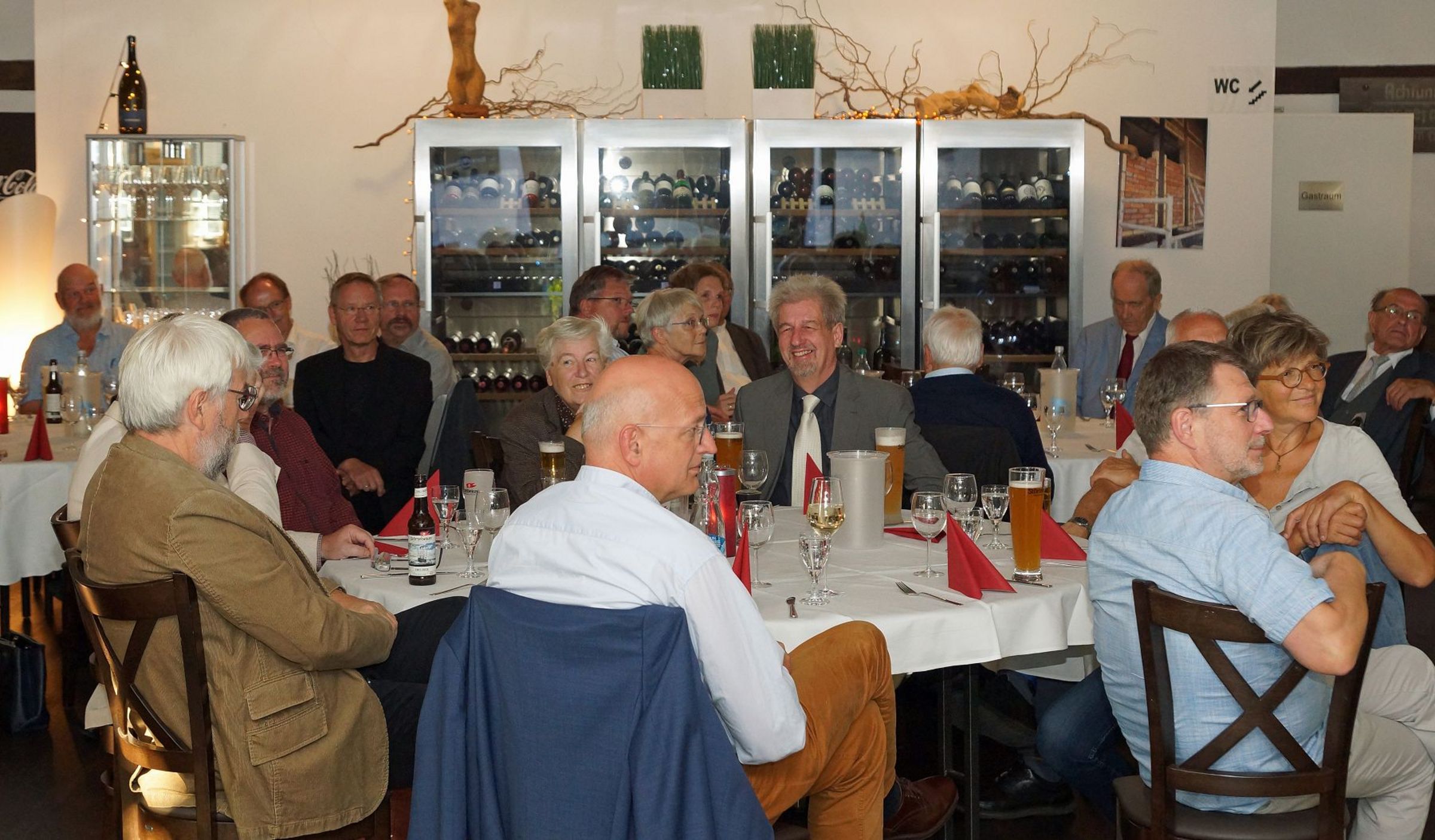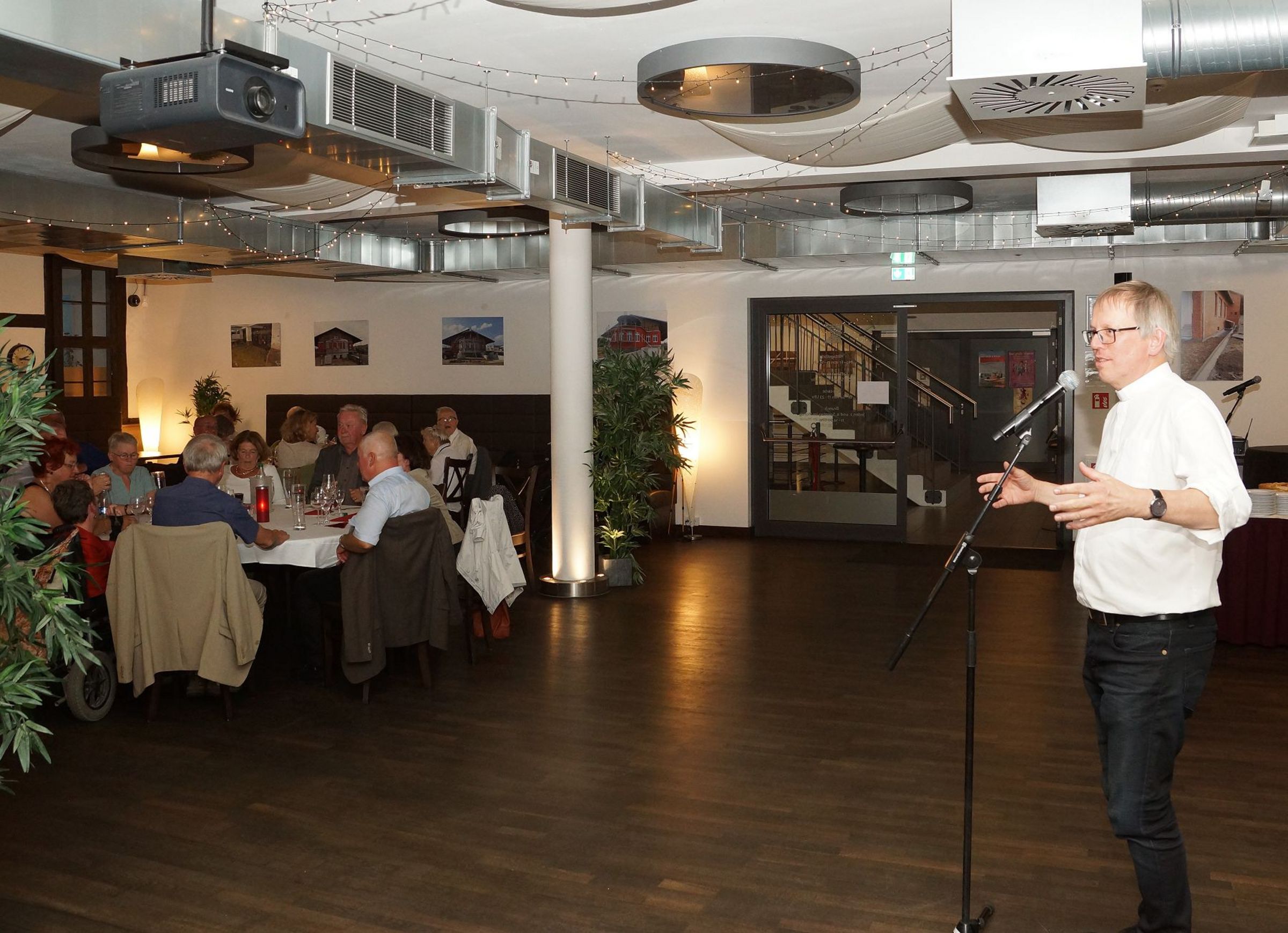 Tilman Jeremias Wunsch, dass der Tag auch dem Austausch zwischen Pommern und Mecklenburg dienen möge, ging am Abend im Greifswalder "Kulturbahnhof" in Erfüllung. In festlicher Atmosphäre wurde erzählt und Erinnerungen ausgetauscht. Propst Gerd Panknin (35-jähriges Jubiläum) und Propst in Rente Karl-Matthias Siegert (30-jähriges Jubiläum) gaben Impulse aus Ihrer Dienstzeit und viele weitere Jubilare schlossen sich an.