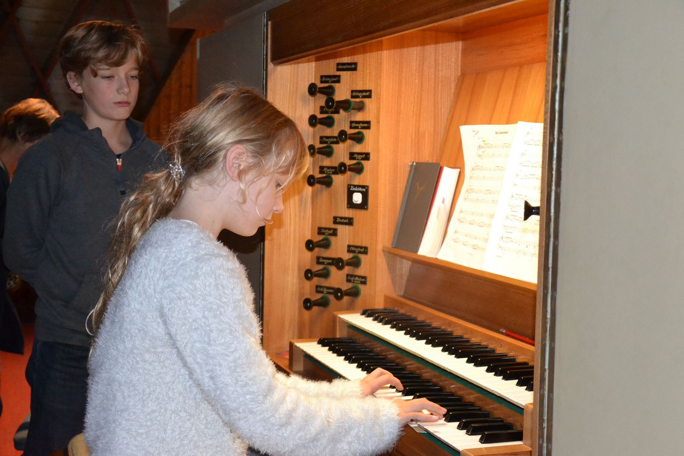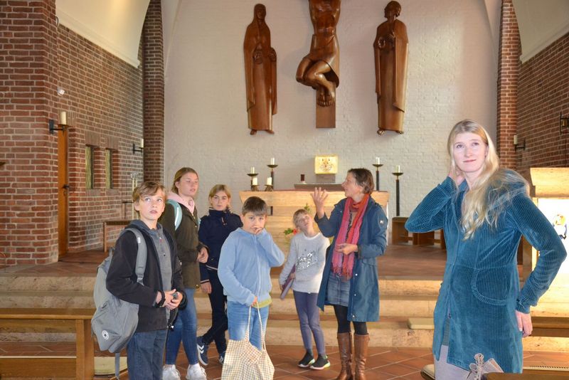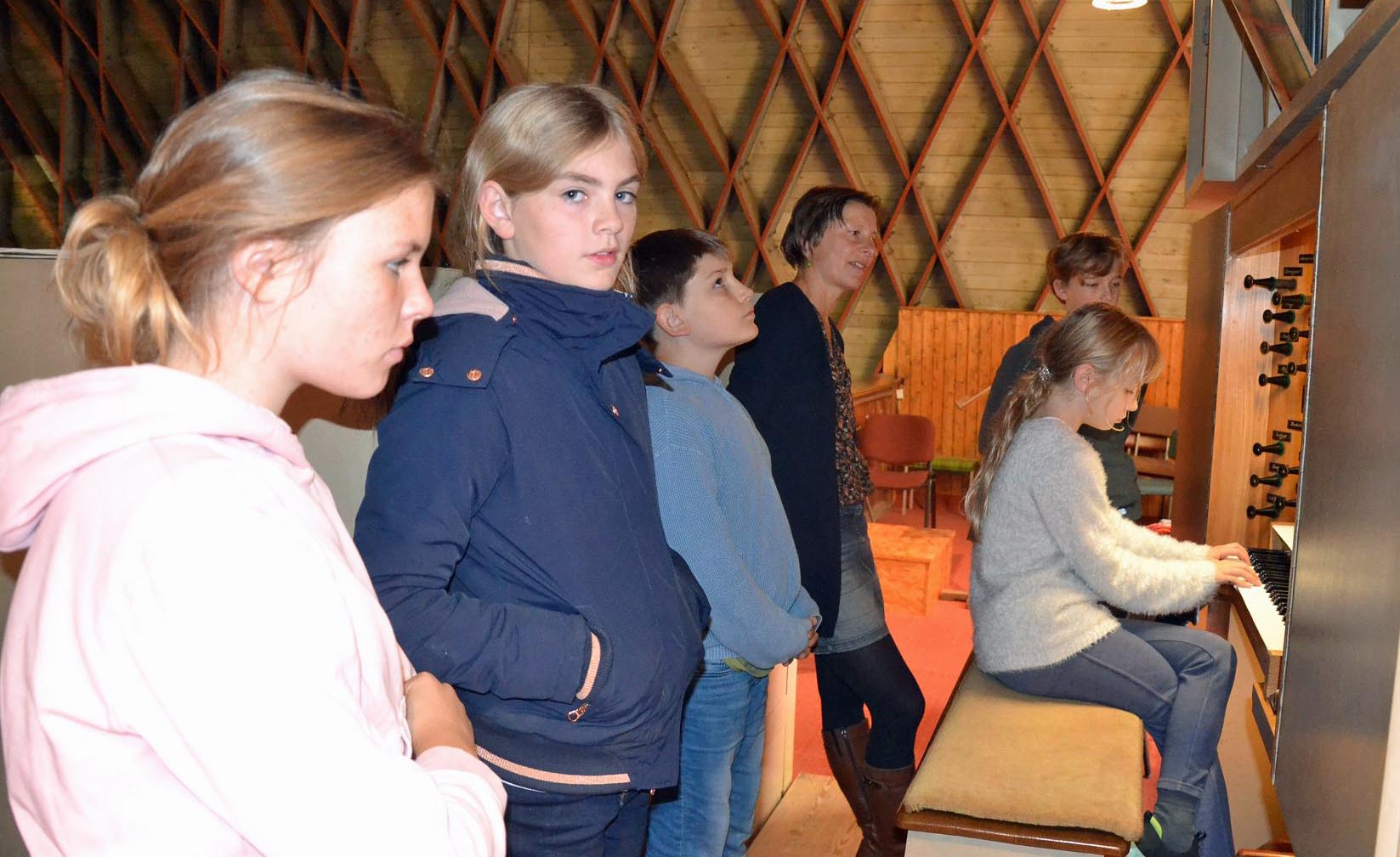 Spannend war auch was Kantorin Christiane Drese über die jeweilige Orgel in den Kirchen erzählen konnte. Die Orgel in der katholischen Heilig-Kreuz Kirche hat zusätzlich einen Zimbelstern, der bei der Drehung sechs Glöckchen anschlägt. Spannend fanden es die Jungen und Mädchen in die Orgel hineinzuschauen und zu sehen, was passiert, wenn die Tasten gedrückt oder die Register gezogen werden. Beim Spielen begannen die Praktikanten kreativ zu werden. „Es ging so auf, wie ich mir das so wünsche“, freut sich Christiane Drese. „im spielerischen Zugang die Orgel und ihre vielfältigen Klangmöglichkeiten zu entdecken, wie klingt denn dieses oder jenes Register. Ich fand das war schon richtig schön lebendig, dass sie Lust haben die Klänge auszuprobieren und ein bisschen improvisatorisch daran geht“.