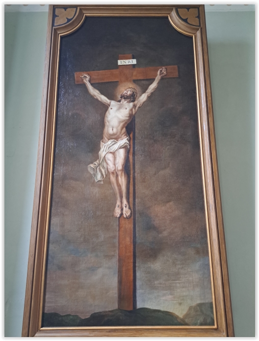 In akribischer Arbeit hat die Diplomrestauratorin Annette Seiffert aus Wismar das Bild „Jesus am Kreuz“ zu neuer Leuchtkraft geführt. „Ich habe die Leinwand vom Rahmen entfernt“, erklärt sie und ergänzt: „Zwei Mal habe ich die Farbe mit Störleim festigen müssen. An manchen Stellen sogar noch ein drittes Mal mit einem Acrylat“. Nachdem die Restauratorin auch noch den Firnis entfernt hatte, regenerierte sie in mehreren Schritten die Malschicht. „So dass ich diese Malschicht“, sagt Annette Seiffert, „die ganz hell und ausgeblichen war, wieder zu ihrer originalen Qualität zurückführen konnte“. Von der Qualität der Farben und der Malweise des Bildes ist sie begeistert. „Ich musste in der Fläche gar keine Farbe nachmalen“, erläutert sie. „Nur an kleinen Fehlstellen war es nötig, Farbe zu retuschieren“. Das Bild sei sehr wertvoll, denn Charles Marcourt wäre damals ein anerkannter Maler gewesen und habe eine gute Arbeit geleistet, so Annette Seiffert. Es sei eine Kopie eines Bildes von Anthony van Dyke, das Maucourt aber wohl nicht im Original gekannt habe, sondern in einer graphischen Darstellung: Jesus am Kreuz, um den Kopf einen Heiligenschein und den Kopf zum Himmel erhoben.