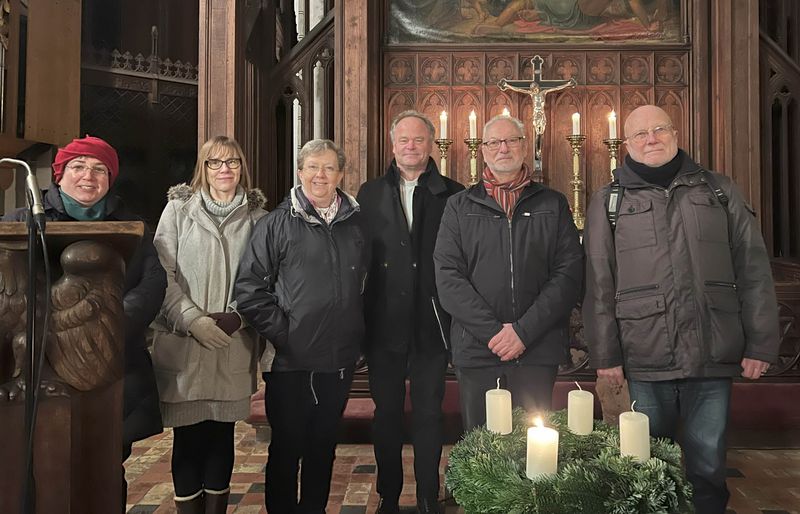 Bischöfin Sarah Bullock: Wir treffen uns dieses Jahr bereits zum 20. Mal im Advent. Von Anfang an dabei ist Terry Bloor, der noch kein Anticipating Advent verpasst hat. Ich war das erste Mal vor vier Jahren hier und dann kam direkt Corona. Da haben wir online Advent gefeiert: Wir haben uns Stollen gekauft und aßen, feierten und beteten gemeinsam auf Zoom – die einen in Mecklenburg, die anderen in England.