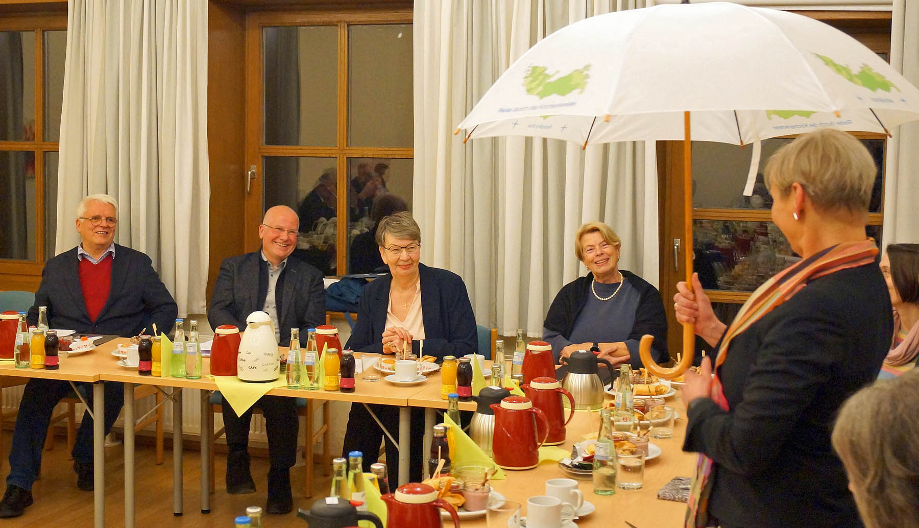 „Vielen Dank, dass wir heute hier auf dieser Rundreise durch den Kirchenkreis bei Ihnen sein durften. Wir haben viele bewegende Eindrücke gewonnen, für die wir sehr dankbar sind“, sagte Kristina Kühnbaum-Schmidt zum Abschluss der Zusammenkunft. Die Landesbischöfin wünschte dem pommerschen Kirchenkreisrat und seinen Mitgliedern Gottes reichen Segen und viel Kraft für die weitere Arbeit. Sie sicherte dem KKR zu, auch weiterhin kontinuierlich in Kontakt zu bleiben. Präses Ulrike Hillmann betonte, dass die Gruppe von ihrem Besuch wertvolle Impulse für die Fortsetzung des Zukunftsprozesses in der Nordkirche mitnehme. Als Gastgeschenk und symbolisches Segenszeichen überreichte Bischöfin Kirsten Fehrs dem Kirchenkreisrat einen Schirm mit dem Aufdruck der Umrisse des Gebiets der Nordkirche und der Beschriftung „Reise durch die Kirchenkreise“. Propst Gerd Panknin, Vorsitzender des pommerschen Kirchenkreisrats, überreichte im Gegenzug der Nordkirchendelegation einige Exemplare einer Landkarte des pommerschen Kirchenkreises, die neben Angaben zu den Kirchengemeinden auch statistische Informationen enthält.
