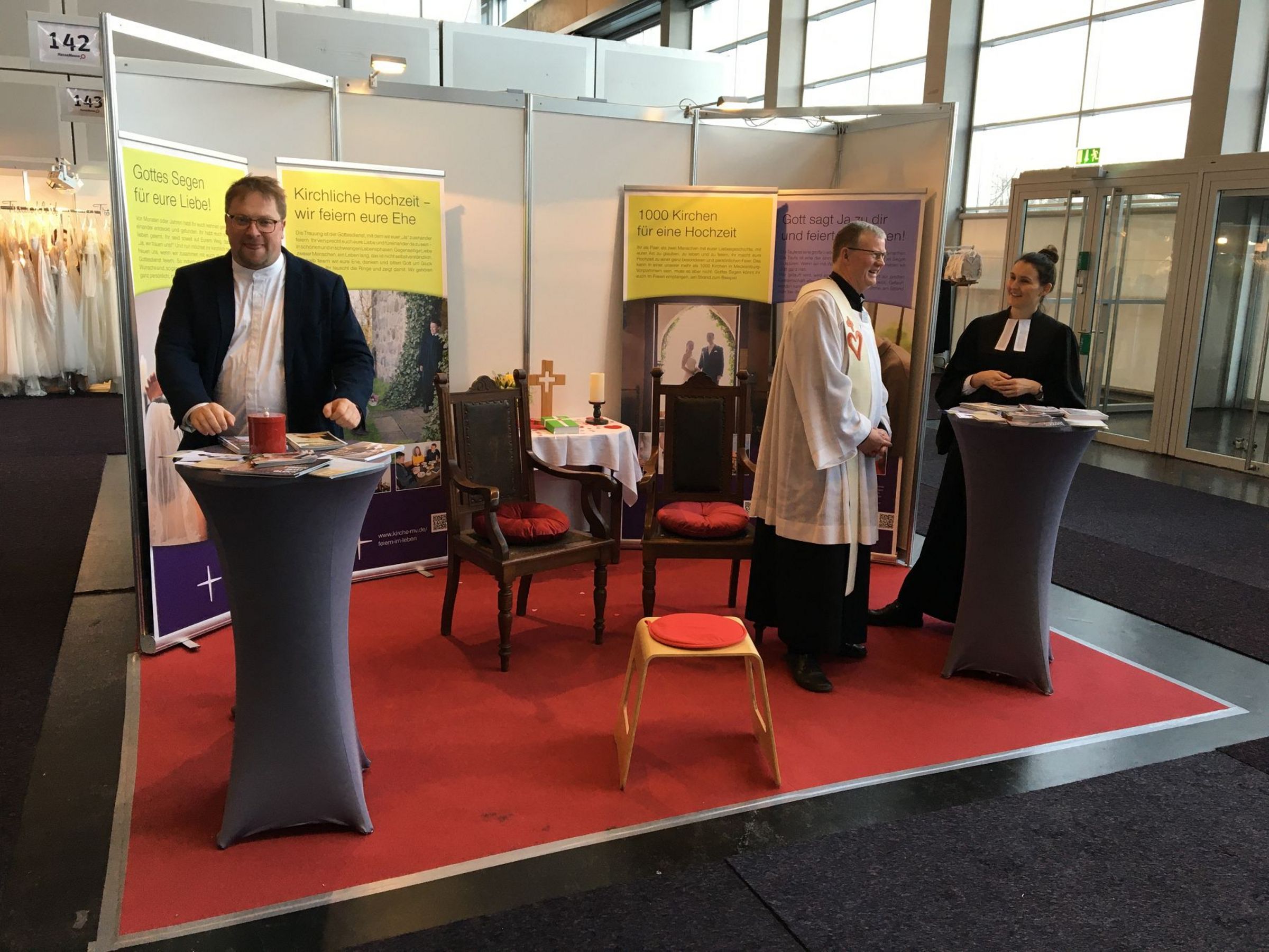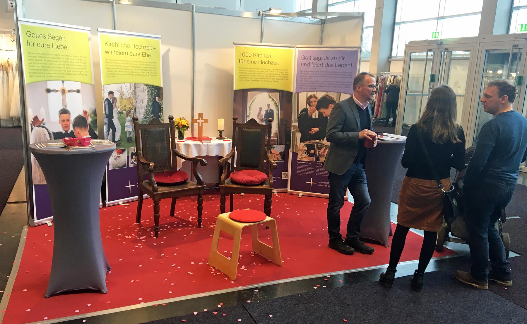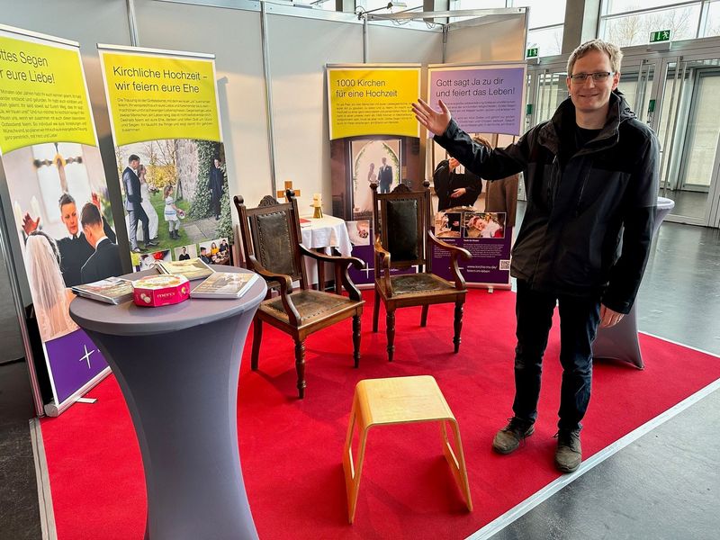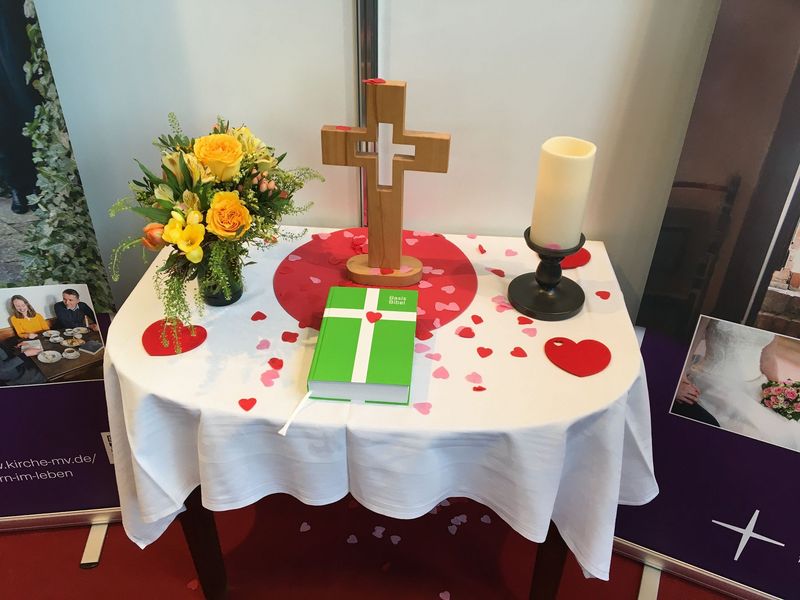 Auf dem Messestand, der mit vier neuen Roll ups zu den Themen kirchliche Trauung und Taufe der Kirchenkreise Mecklenburg und Pommern, zwei Hochzeitsstühlen, Stehtischen und einem kleinen Altar einladend und auffällig gestaltetet war, lag natürlich auch eine Bibel. „Diese habe ich spontan an einen Besucher verschenkt. Er hatte mir erzählt, dass er noch nie darin gelesen hätte“, so Pastor Gunkel. „Im Auto hatte ich noch eine Bibel, so dass der Altar flugs wieder komplett war.“ Zum kirchlichen Stand führte nach einigen Stunden sogar eine Konfettispur. Denn auf dem Altar und dem roten Teppich hatte Pastor Stephan Fey kleine Herzchen als Konfetti ausgestreut, die die zahlreichen Besucher unter ihren Schuhen überall hin verteilten. Gezielt sprachen die evangelischen und katholischen Mitarbeitenden - teils in Talar und Albe - die Besucher an, luden sie ein, sich zu informieren.