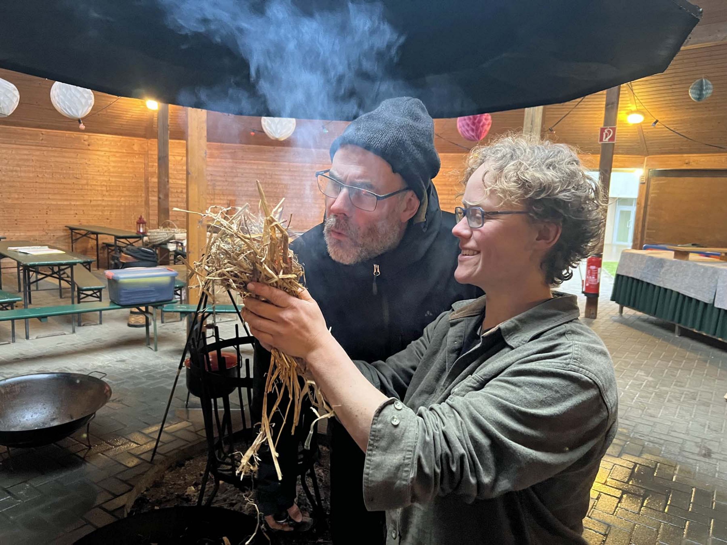 Dass Kirche sich für Jugendliche öffnen muss, meint auch Christina Blohm. Bei einem Workshop stellte sie das Konzept der Held*innenreise vor, das für die Seelsorge mit jungen Leuten Impulse liefern kann. Beim Markt der Möglichkeiten zeigt sie, wie man aus einem Stein Funken schlagen kann und kocht in einem großen eisernen Kessel über der Flamme Punsch. Bevor sie sich zur Wildnispädagogin und systemische Beraterin ausbilden ließ, arbeitete sie als Gemeindepädagogin: „Gerade Jugendliche und junge Erwachsene sind auf der Suche. Es muss eine Öffnung passieren, es soll nicht gesagt werden, wer Gott ist, sondern sie sollen darin frei sein, ihn zu finden. Gerne ein Gebet oder ein Segen, aber sonst möchte ich die Sache selbst ausprobieren und einfach einen Ort haben, wo ich mich entwickeln und nachdenken kann. Das muss kein Bibelkreis sein, aber ein Ort, wo Gemeinschaft gelebt wird.“