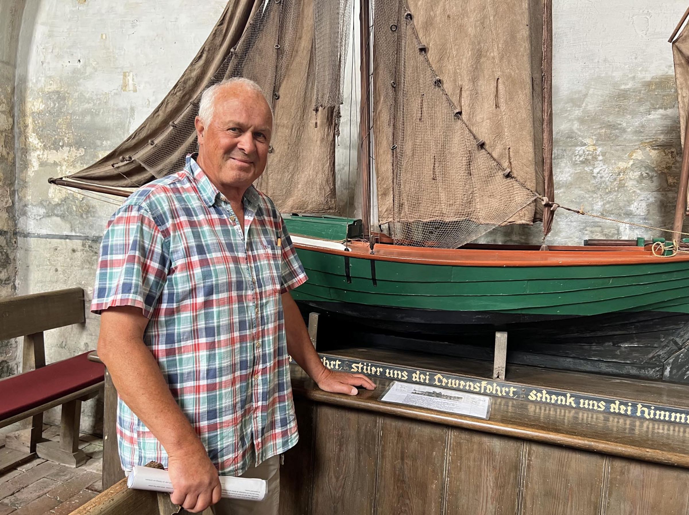 Wenn ich hier die Kirche offenhalte, ist das auch für mich ein bisschen Einkehr, am liebsten an der Zese. Die interessiert auch die Besucher. Da steht drauf: „Segne uns die Seefahrt, steuer‘ die Lebensfahrt, schenk uns die Himmelfahrt.“ Diese Zeese wurde als maßstabgetreues Boot 1936 gebaut von einem Poeler Fischer, dessen Bruder angeblich umgekommen war und dann doch überlebt hatte. Aus Dankbarkeit hat er die gebaut.