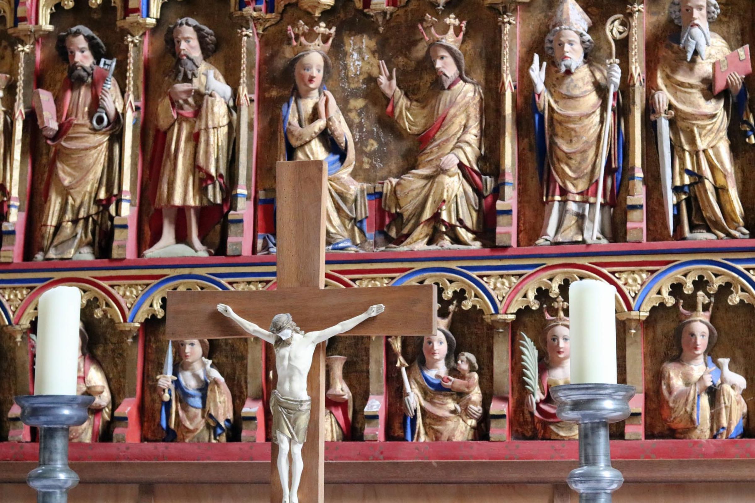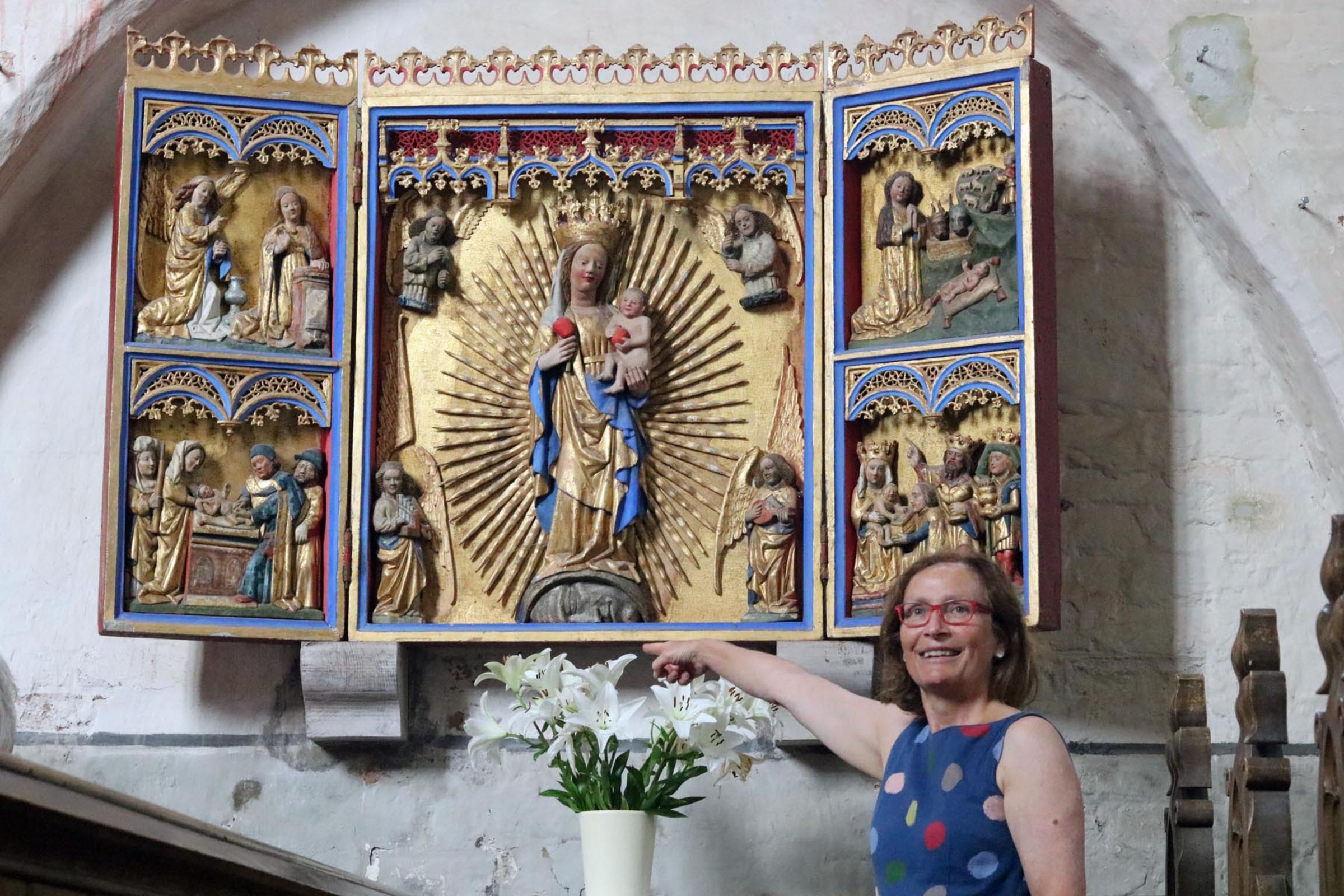 Eine Detektivarbeit erwartet die Teilnehmer vor dem Hauptaltar: Zu jeder der detailverliebt geschnitzten biblischen Figuren und Heiligen hat Maria Pulkenat mit Attributen verteilt. „Der blühende Rosenzweig“ auf einem führt zu Dorothea, über das „Salbengefäß“ lässt sich Maria Magdalena identifizieren, am „Lamm“ ist die heilige Agnes zu erkennen.