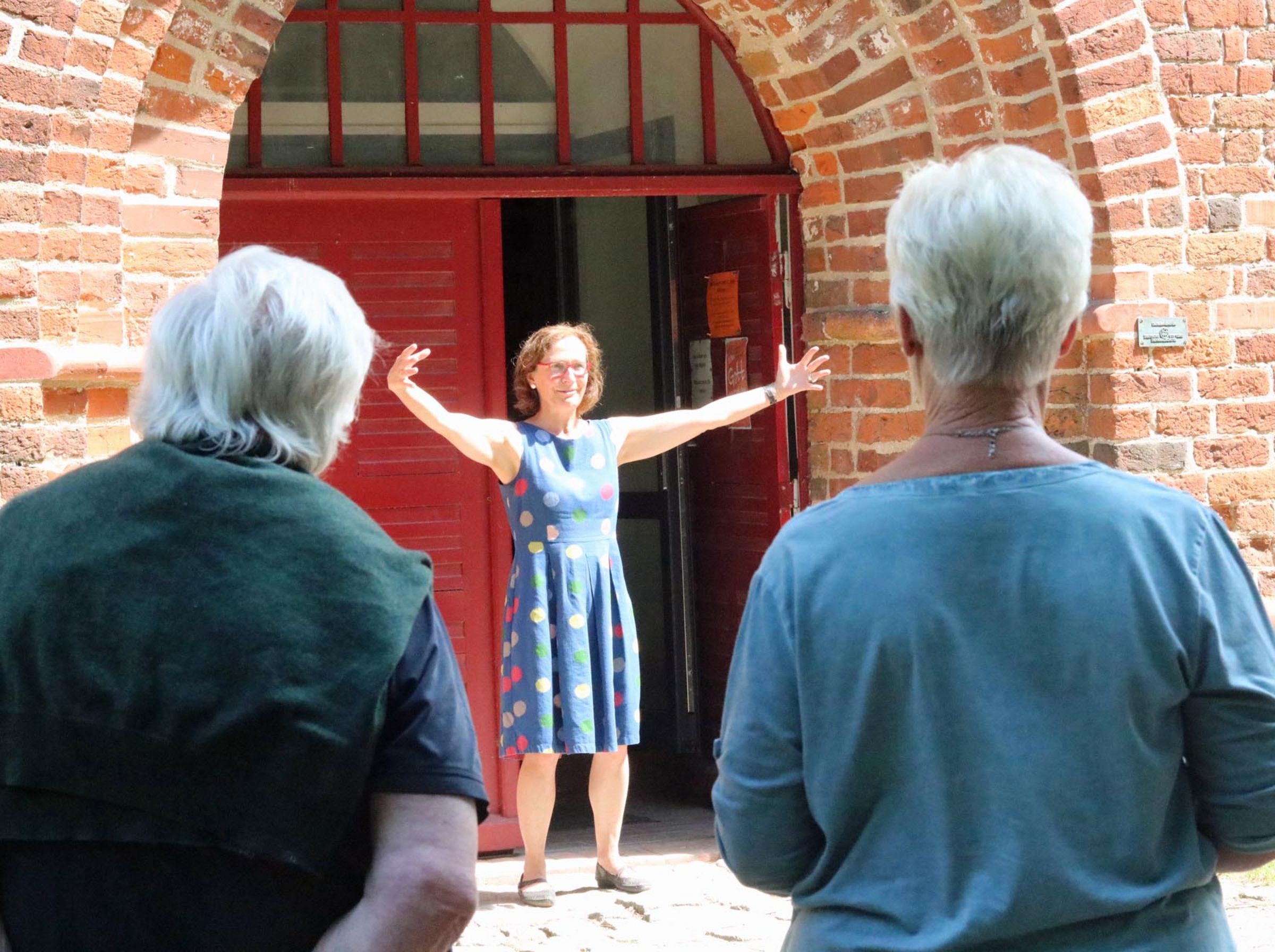 Mit einem Rundgang um die Kirche beginnt die Kirchenpädagogin die Erkundung. Sie stellt sich mit weit ausgebreiteten Armen in das gerundete Kirchenportal: „Herzlich willkommen, kommt rein, ruft so ein Portal“, sagt sie. Sie erzählt, wie aus Lehm der Backstein, der den Kirchen im Norden ihr charakteristisches Aussehen gibt, entsteht. Solche Informationen verbindet sie gerne mit einer weiteren Dimension: „Jede Kirche ist nach Osten ausgerichtet. Jede Kirche hat ihren kosmischen Bezug.“
