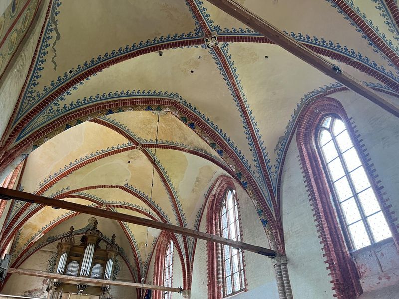 Der Blick bleibt nach oben gerichtet: „Wer hat das Joch? Und wo finden wir es hier?“ „Das Gewölbefeld, glaube ich…“, sagt Martina Jokuscheit, Gewölbeführerin aus Wismar. Maria Pulkenat freut sich über die treffende Antwort. „Von hier“, sie schreitet ein paar Bodenplatten ab, „bis hier. Das ist ein Gewölbeabschnitt, ein Joch.“