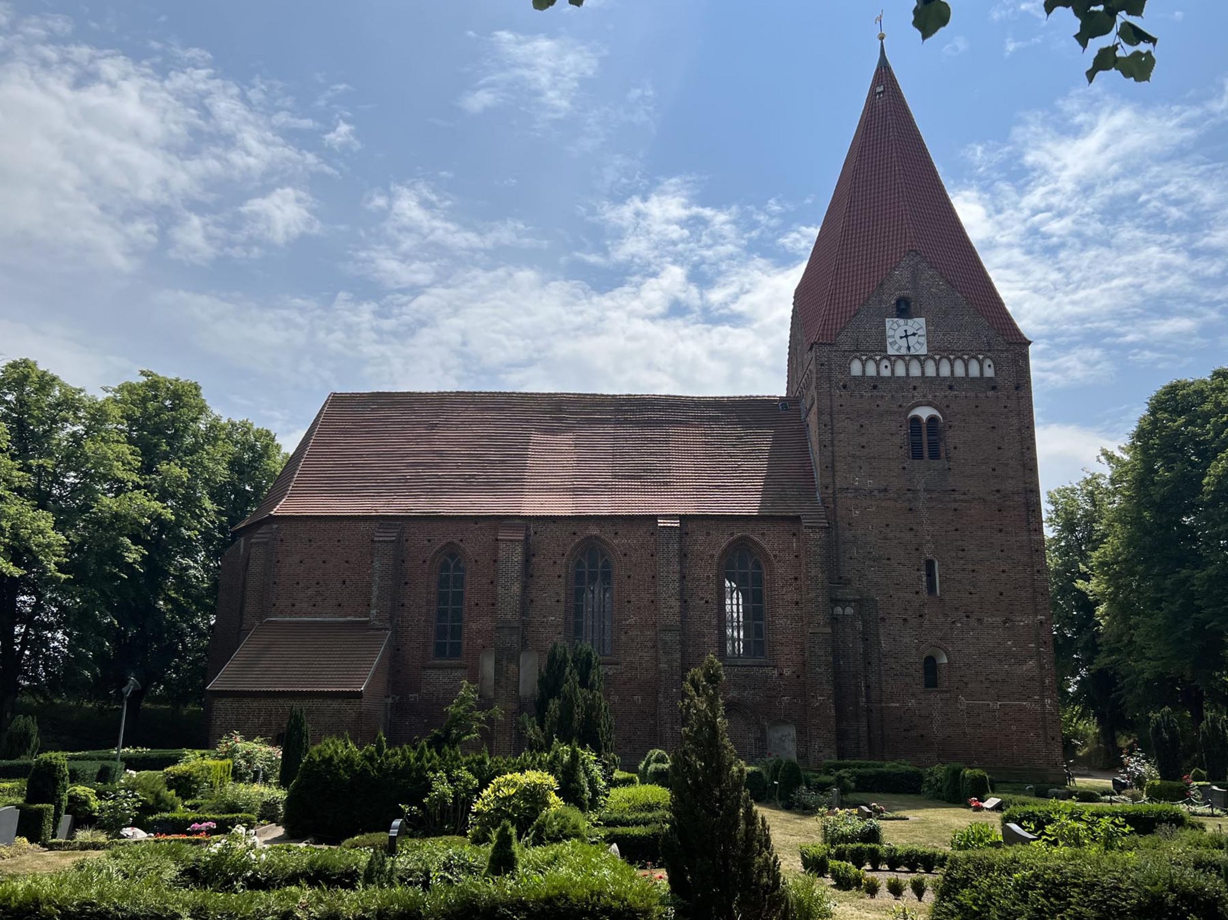 Unter der Bischofsmütze gibt’s Kaffee und Kuchen. Die Kirchentür steht offen, und in das Innere des Turmraums mit dem kühlen Steinboden linst der Sommer. Bischofsmütze ist der Spitzname des achteckigen Kirchturms, den man schon vom Festland aus rot leuchten sieht. Seit vielen hundert Jahren hält der Turm die Wacht über die Insel Poel nördlich von Wismar.