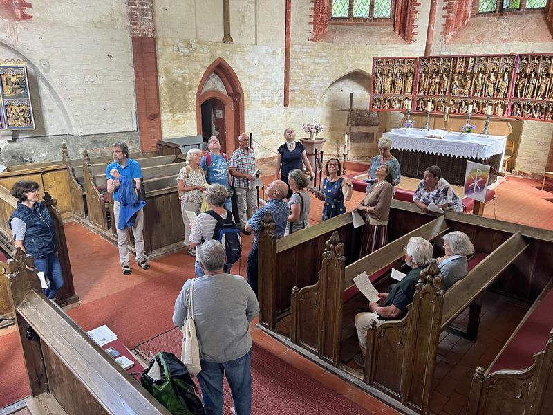 Etwas von dieser Unerschütterlichkeit strahlen auch die Insulaner aus, die an diesem Nachmittag ihre Kirche besser kennenlernen wollen. „Das sind ganz engagierte Menschen, die dort mehrere Stunden sitzen“, sagt Maria Pulkenat, „sie alle eint, dass sie sich mit ihrer Kirche sehr verbunden fühlen. Das Gebäude spricht zu ihnen und sie sind in Resonanz mit den Kunstschätzen“. In Kirchdorf auf Poel ist es ein Kreis von 14 Ehrenamtlichen, die sich nach der Pandemie gefunden haben. „Wir haben hier täglich zwischen 50 und 100 Besucher“, erzählt Hubertus Gustav Doberschütz. Im Sommer könnten es auch mal 150 sein. Für die steht die Kirche täglich offen.