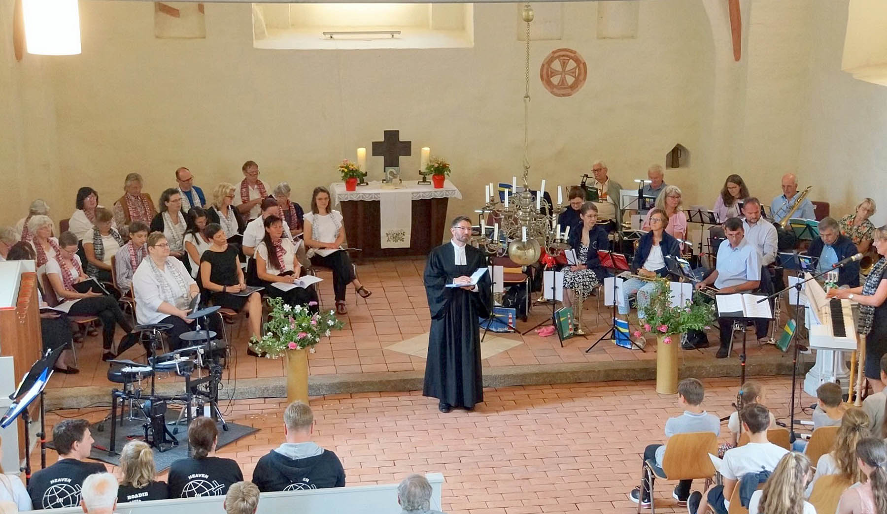 „Unseren zahlreichen Ehrenamtlichen, dem größten Schatz unserer Kirchengemeinde, dankten wir für allen verlässlichen und herzlichen Einsatz, hör- und sichtbar und ebenso in der Stille des Gebets und im praktischen Arbeiten im Hintergrund“, berichtet Pastor Christof Rau vom Dankesfest. „Unserer Kantorin Gerhild Heller dankten wir für nunmehr 22 erfrischend beschwingte, einfühlsam zugewandte Jahre ihres Dienstes, in denen sie stets mit musikalisch vielseitigem Repertoire Klein und Groß begleitete, herausforderte und förderte, um unsere Kirchengemeinde auf besondere Art vielseitig zum Klingen zu bringen. Das wurde im Festgottesdienst durch 57 gemeinsam musizierende Chorsängerinnen und -sänger, unsere Band ‚Heaven on Earth‘, Bläserchor und Flötenensemble mehr als deutlich.“