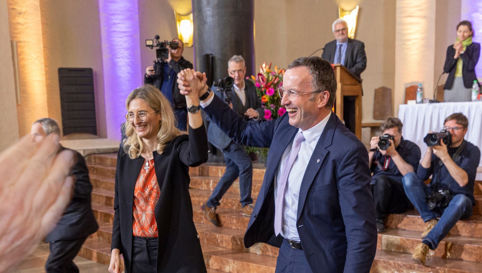 Die Landshuter Dekanin Nina Lubomierski und der Muenchner Regionalbischof Christian Kopp bei der bayerischen Bischofswahl