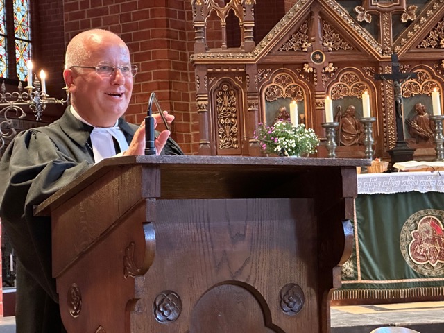 In den Mittelpunkt seiner Predigt stellte Dirk Sauermann die Haltung der Dankbarkeit. Er skizzierte, dass in einer „so hoch individualisierten Gesellschaft, die auf der permanenten Selbstermächtigung und Selbstverwirklichung beruht – es dem Einzelnen schwerfällt, eine Adresse für Dank außerhalb seiner selbst“ zu sehen.
