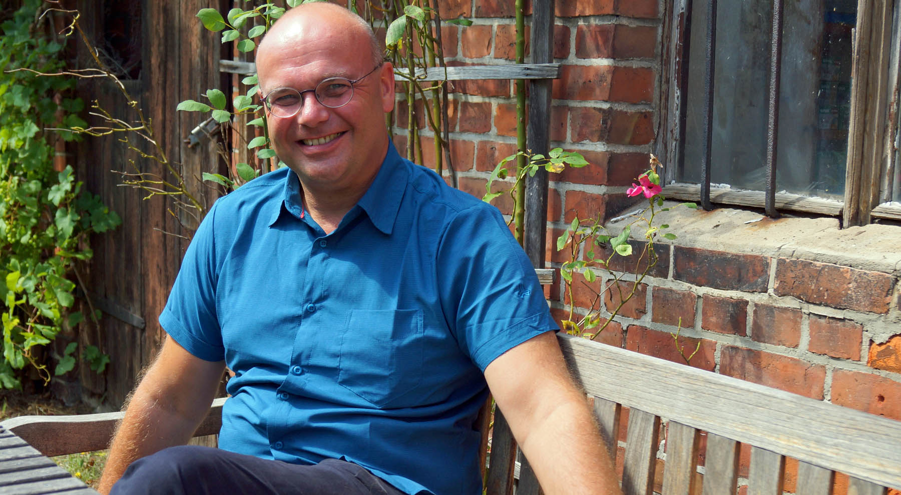 Propst Philipp Staak im Garten der Propstei Pasewalk. Der Garten ist der Lieblingsplatz des Propstes, an den er sich an schönen Tagen gern für einen Moment des Gebets zurückzieht.