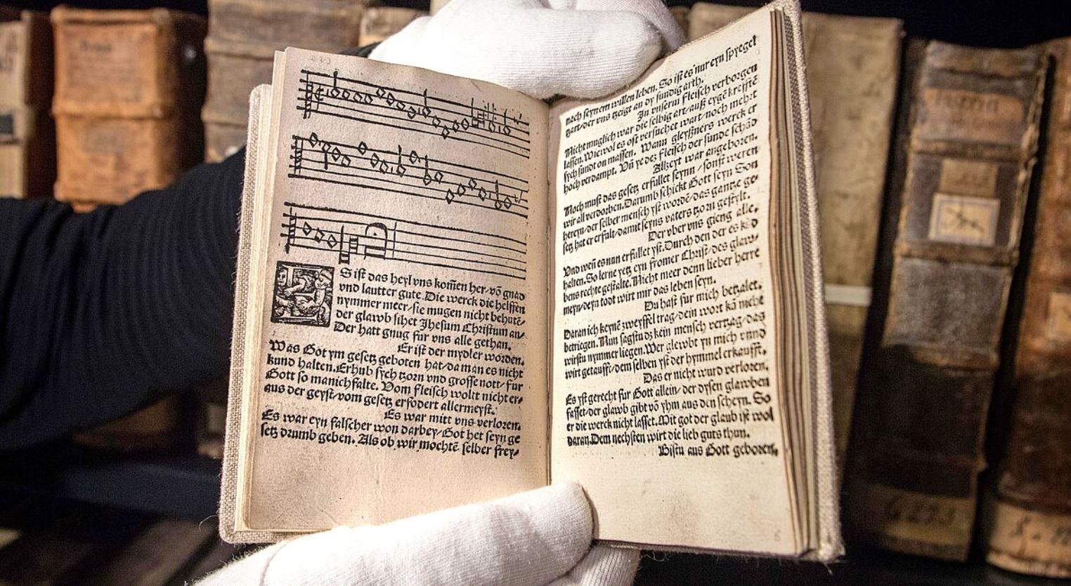 Von Anfang an waren in den Drucken Melodien verzeichnet. Das gilt auch für das „Achtliederbuch“, das der Nürnberger Drucker Jobst Gutknecht um die Jahreswende 1523/24 herausgab. Das Büchlein enthielt bereits vier Lieder von Martin Luther (1483-1526), darunter die Nachdichtung des 130. Psalms „Aus tiefer Not schrei ich zu dir“. Kurz darauf kam in Erfurt das „Enchiridion“ (Handbüchlein) heraus, versehen mit polemischen Seitenhieben gegen den alten Kirchengesang („Geschrei der Baalspriester“). Und noch im selben Jahr erschien in Wittenberg das „Geistliche Gesangsbüchlein“ des Kantors Johann Walter mit 43 Liedern nebst Vorwort des Reformators. Es gilt als erstes Chorgesangbuch.