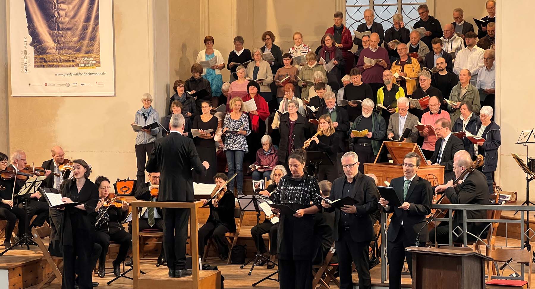 Passend zum Wahltag stand die sogenannte „Ratswechselkantate“ auf dem Programm: Der Chor der Greifswalder Bachwoche, Solistinnen, Solisten und das Orchester für Alte Musik Vorpommern führten unter der Leitung von Professor Frank Dittmer Johann Sebastians Bachs Kantate „Preise, Jerusalem, den Herrn“ (BWV 119) auf, die Bach 1723 für die Feierlichkeiten zum Wechsel des Leipziger Rates komponiert hatte.