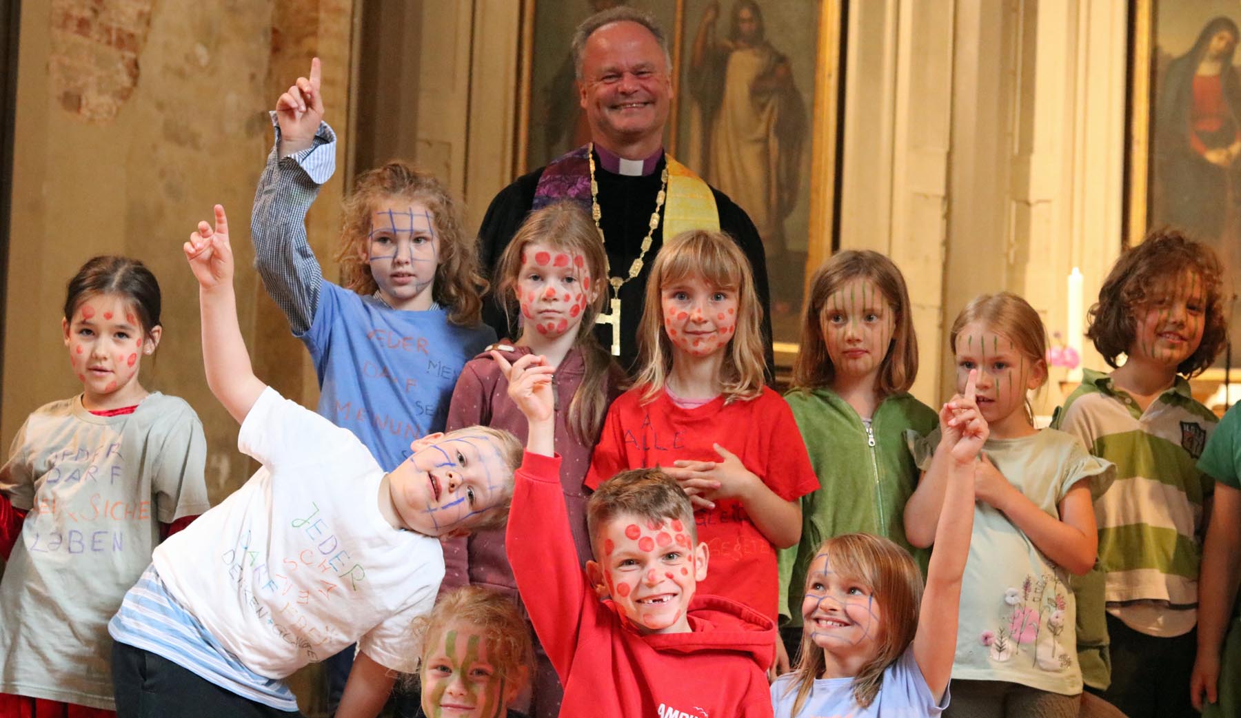 Bunt geschminkte Schülerinnen und Schüler der Martinschule führten das Singspiel „Im Land der Blaukarierten“ von Klaus Hoffmann auf. Dort machen die Menschen eine Entwicklung durch von „Der passt zu uns doch nicht! Er soll von hier verschwinden, der grüngestreifte Wicht!“ zu „Willkommen hier im Land! Hier kannst du mit uns leben, wir reichen dir die Hand!“