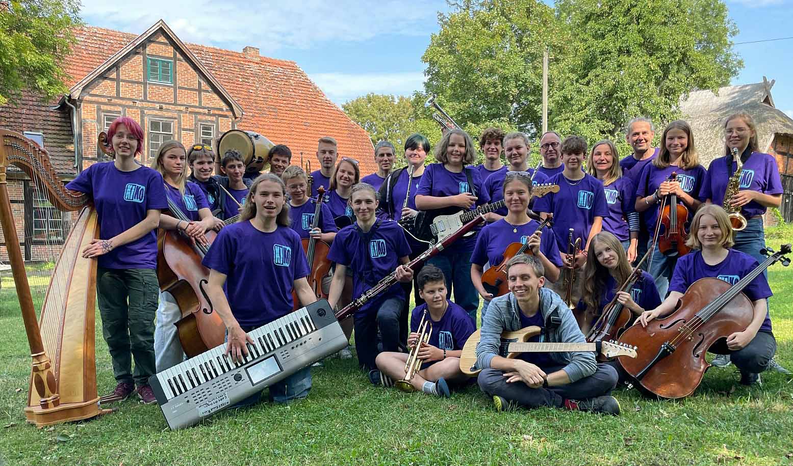 Im Spätsommer machten sich nun wieder einmal 23 musikbegeisterte Jugendliche, ein wunderbares Küchenduett und ein hochmotiviertes Leitungsteam auf den Weg zum alten Pfarrhaus in Kirch Kogel. Andreas und Thomas Braun sowie Charlotte Lange (seit vielen Jahren ehrenamtlich beim Musikprojekt engagiert) hatten viele Noten für ein farbenfrohes Bouquet an Instrumenten im Gepäck: Geigen, Celli, Kontrabass, Flöten, Trompeten, Fagott, Keyboards, Gitarren, Bass, Xylophon, Glockenspiel, Schlagzeug und sogar eine Harfe.